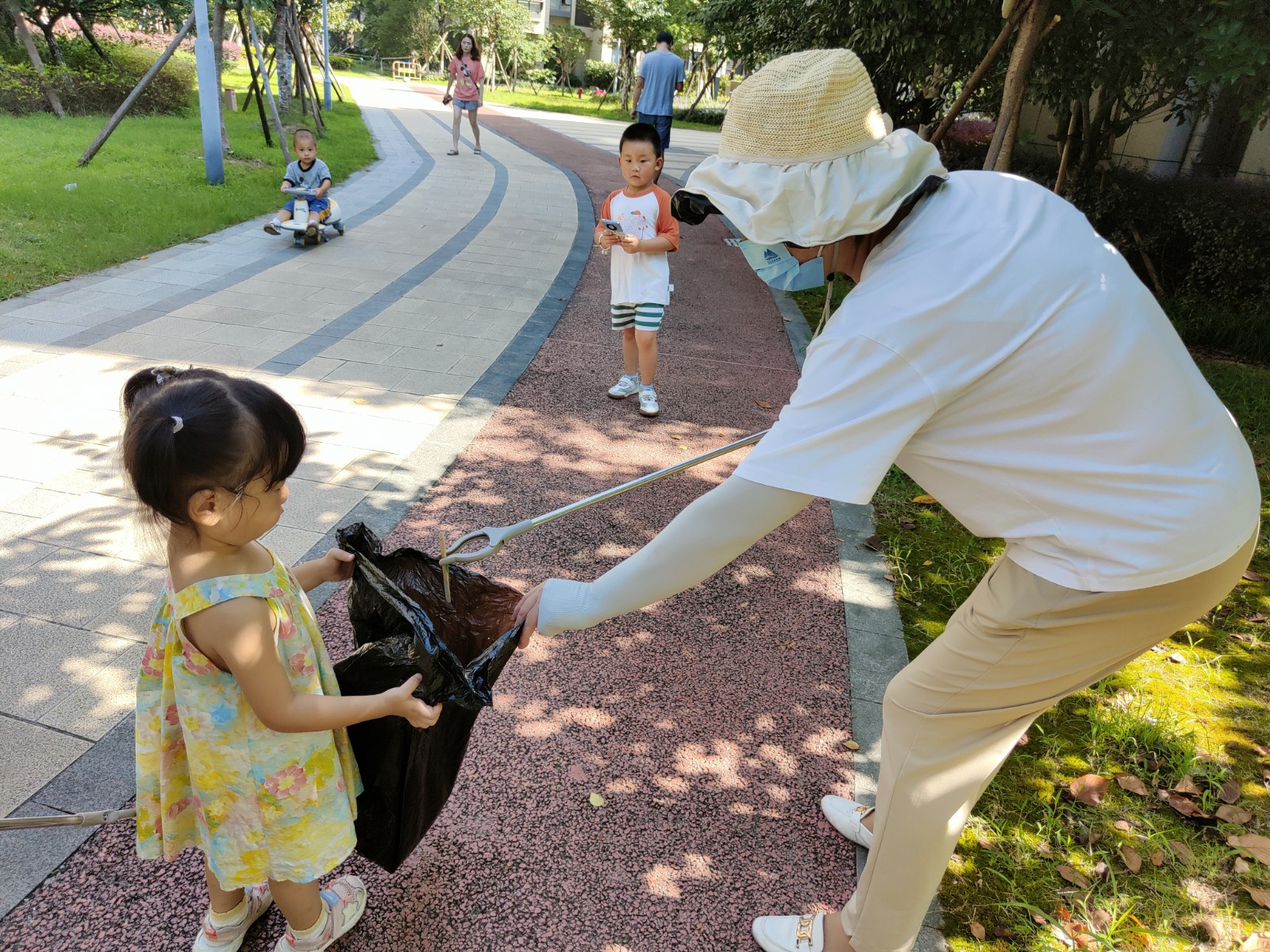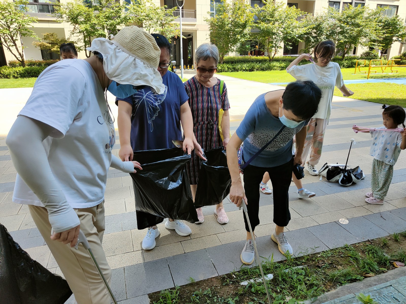“一老一小”志愿者顶着炎炎烈日,一手持钳子,一手拿垃圾袋,对小区道路上的白色垃圾、饮料瓶、塑料袋、烟蒂等各种垃圾进行地毯式捡拾,对花坛边的杂草、落叶和枯藤进行一一清理。随后,小志愿者们对清理出来的垃圾进行仔细地分类处理。经过大家的共同努力,小区的环境焕然一新。