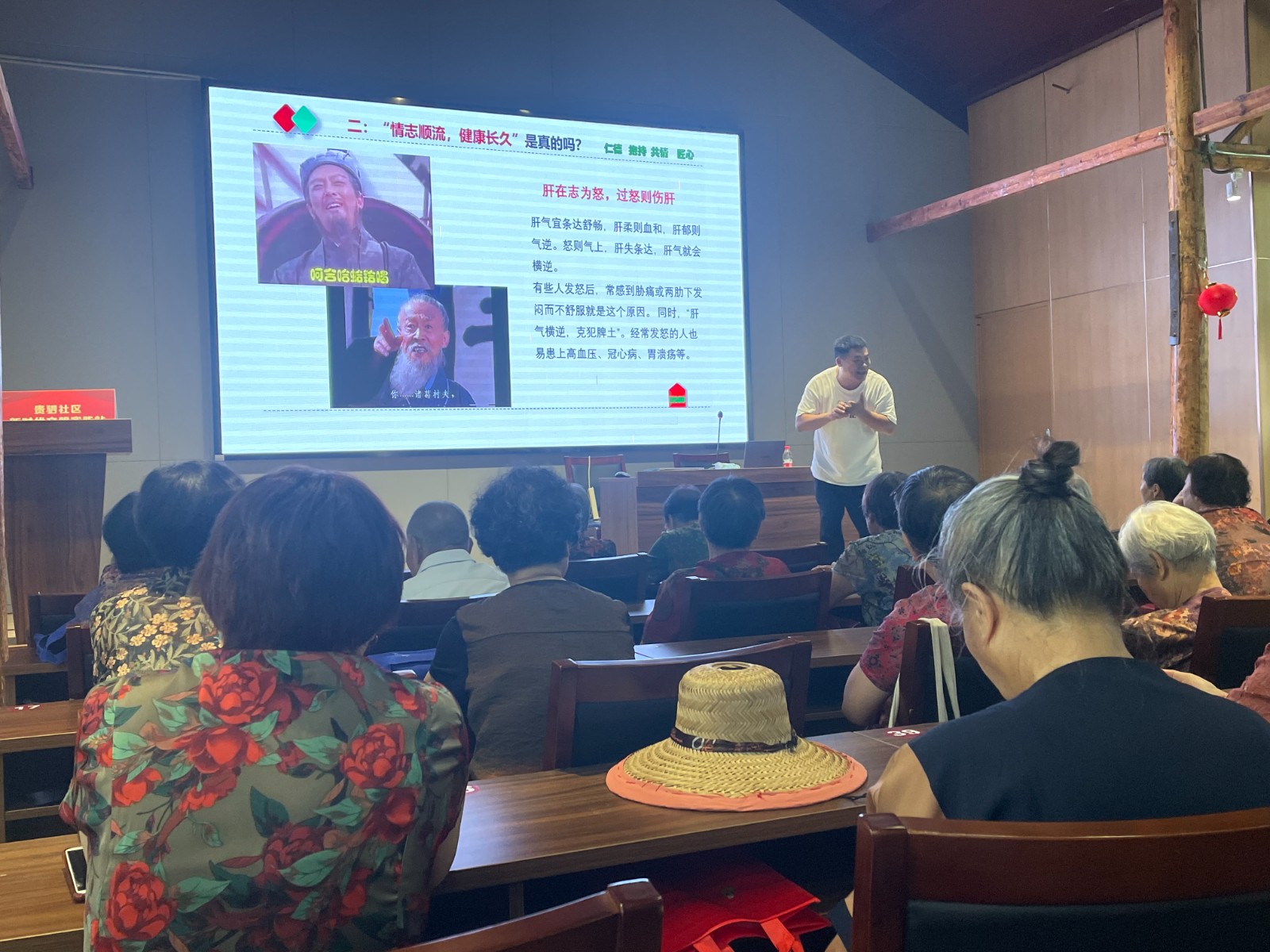 本次心理健康讲座邀请了国家二级心理咨询师熊强为大家带来了深入浅出、通俗易懂的心理健康知识分享。活动中,熊老师从老年人的生活规律、气温环境的改变等方面,引出容易引起情绪波动的原因,指出何谓“情志顺流”:有机体对外界环境刺激做出情绪反应时,情绪可以平和、自认、轻松地流经身体,不积聚在身体之内阻碍五脏六腑及整个身体的新陈代谢,同时指出肝在志为怒,过怒则伤肝。熊老师建议老年居民们多运动、多交友、多学习、多动脑,保持心情平和,及时处理不良情绪,保持乐观的心态,丰富自己的晚年生活。
