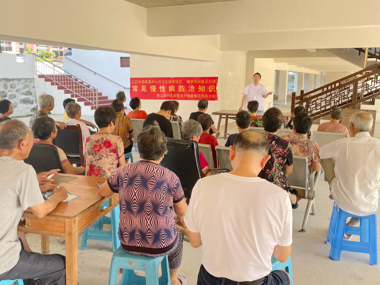 本场讲座由西周卫生院医务科副科长陈恩伟担任主讲,陈医生以常见慢性病防治知识为主题,用通俗易懂的语言为在场村民讲解了高血压、高血糖等常见慢性病的发病原因以及危害并教大家正确使用家用血压计测量血压和分析数据,应如何选择和服用药品。陈医生告诉大家,中老年人平时应该学会自我调节情绪、合理膳食、适量运动、顺时养生,不要盲目吃保健品。