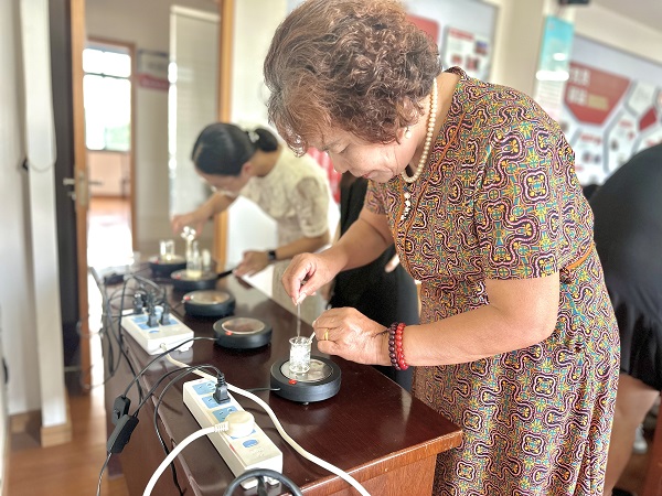 活动当天,社区的老年人早早来到文化礼堂围坐等候。在润唇膏制作环节,老人们按照老师的讲解将蜂蜡、杏仁油等几种天然安全的材料,依比例调和、加热溶解、倒入模具、冷却成型……不多久,一支支“专属定制”润唇膏便新鲜出炉。