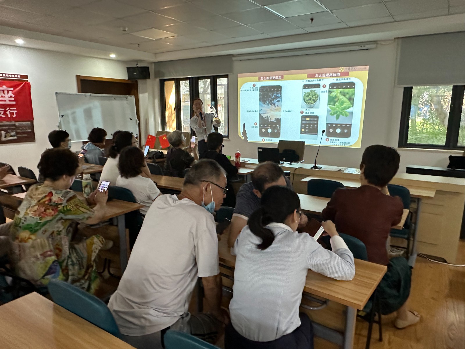 培训之前,授课老师精心准备了PPT、抢答题、爱心包等教学器具。针对老年人使用智能手机能力不一的实际,授课老师从零起步,仔细讲解下载安装“新江北”、“浙里办”、微信等小程序的操作步骤,边配合PPT讲解、边用手机演示,让学员们了解如何通过“浙里办”APP预约挂号、查付医保,让学员们学习微信添加好友、音视频聊天、发朋友圈、收付款、定位导航等使用方法,并指导学员现场操作、相互观摩,老师还对有疑惑的居民一对一进行了详细讲解。让老年人更安全、更安心地使用智能手机。随后,还为社区老人讲解手机摄影技巧,先从手机自带的基本功能及特性、构图的技巧、拍摄的效果进行讲解。通过实际拍照,让大家逐步掌握拍摄的技巧。