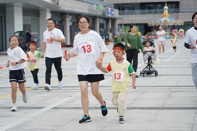 活动现场热闹非凡,大家有序签到,领取跑服,贴上号码牌。天悦社区邀请了专业长跑运动员带领大家进行了热身运动。有身穿统一赛跑服装的一家三口,也有老老少少相伴而来的祖孙四代,随着一声令下,50余组亲子家庭根据比赛划定的路线奋力向前跑去。大手拉着小手,在五星红旗映衬下,大家整装蓄势待发。各个家庭在楼宇间不停滴穿梭打卡,路人们纷纷为他们加油打气。