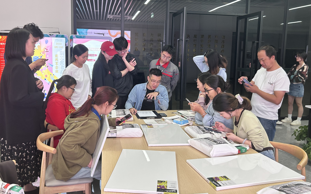 活动现场,宁波职业技术学院的封思勇老师带领大家从认识丙烯画开始,详细讲解色彩的三要素、丙烯的特点、色彩的调和、背景的涂色手法、起草线稿注意事项和整体配色的技巧。 听完老师的讲解后,职工朋友们纷纷拿起画笔,充分发挥自己的想象力,挥动手中的笔刷,新奇构思、大胆作画,跟着老师的节奏渐入丙烯色彩画的美妙世界。