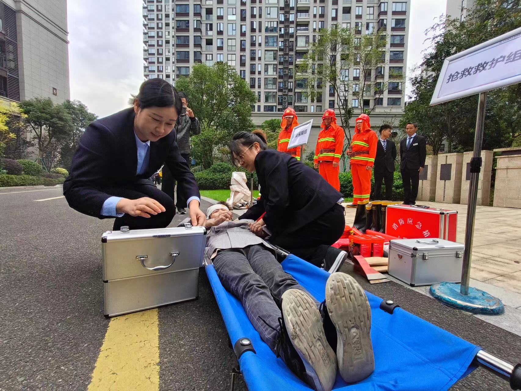 在活动现场,伴随着一阵响亮的“火灾”报警铃声,一场实战消防安全演练正式开启。演练假定江北区甬江街道青秀澜湾小区10幢楼发生“火灾”,并有部分“被困居民“,同时“火势”有向周边蔓延的趋势。甬江街道万象社区网格员和中铁建物业工作人员先行赶到“火灾”现场进行扑救,并对内部“被困居民”进行有效疏散,不到10分钟,“被困居民”被万象社区网格员和中铁建物业工作人员用担架抬出危险区域。最终,在甬江街道万象社区和中铁建物业工作人员的共同配合下,“火势”得到了控制,实战演习取得圆满成功。“这次活动形式很好,现场还有消防员详细给我们介绍平时是怎么使用灭火器的,让我开了不少眼界。”居民周阿姨说。