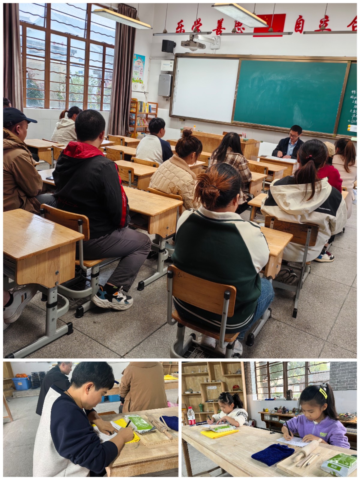 活动开始,家长和孩子分别填写了一份调查问卷,问卷用意是检验家长是否真的了解自己的孩子。完成后,三溪口小学的罗老师向爸爸妈妈们介绍了学校的陶艺特色及姚创客相关活动。很快到了动手环节,罗老师让孩子们以泥板作相框,定格下家庭成员间最美好的瞬间。爸爸妈妈们和孩子一起热火朝天地制作起来。很快,一幅幅充满爱的作品呈现在了我们面前:有幸福的一家四口,有怀抱新宝宝的快乐母女,有手拉手的姐妹俩……欢声笑语中,本次活动接近了尾声。社区学院徐文吉副院长就问卷调查结果家长们做了详细的反馈,帮助他们更好地了解孩子,不断加强与孩子的沟通交流。