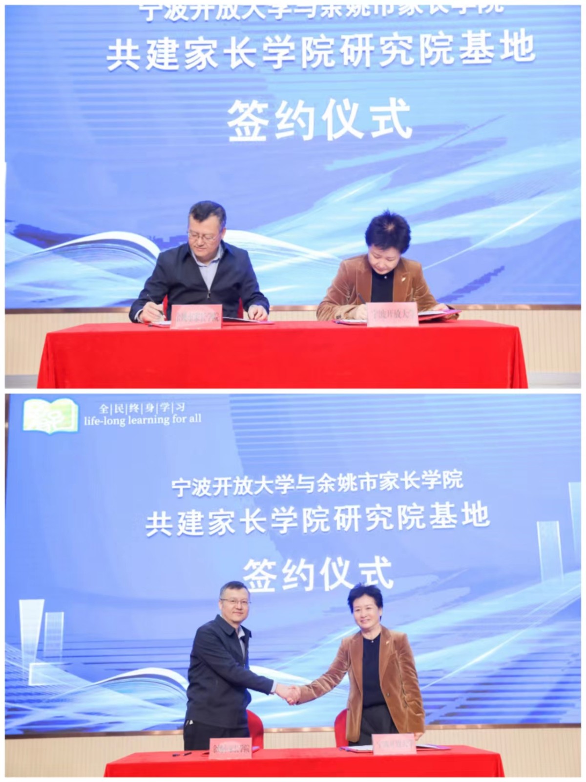 启动仪式上,宁波开放大学与余姚市家长学院签订了共建家长学院研究院基地协议。市社区学院与朗霞成校交接了2024年全民终身学习周启动仪式承办会旗。