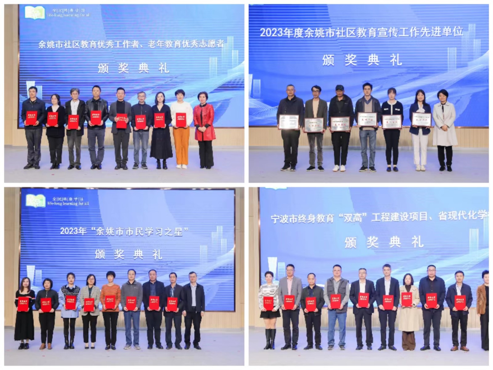 在唐飞琴局长宣布活动周开幕后,启动仪式进入第二阶段,市教育局对“余姚市市民学习之星”、“余姚市社区教育优秀工作者” 、“余姚市老年教育优秀志愿者”、“2023年度余姚市社区教育宣传工作先进单位”和宁波市终身教育“双高”工程建设项目、2022年度省现代化学校等进行了表彰,同时观看了由大隐成校、市老年大学及市社区学院选送的精彩节目,展示了我市青少年校外教育和老年教育的优秀成果。