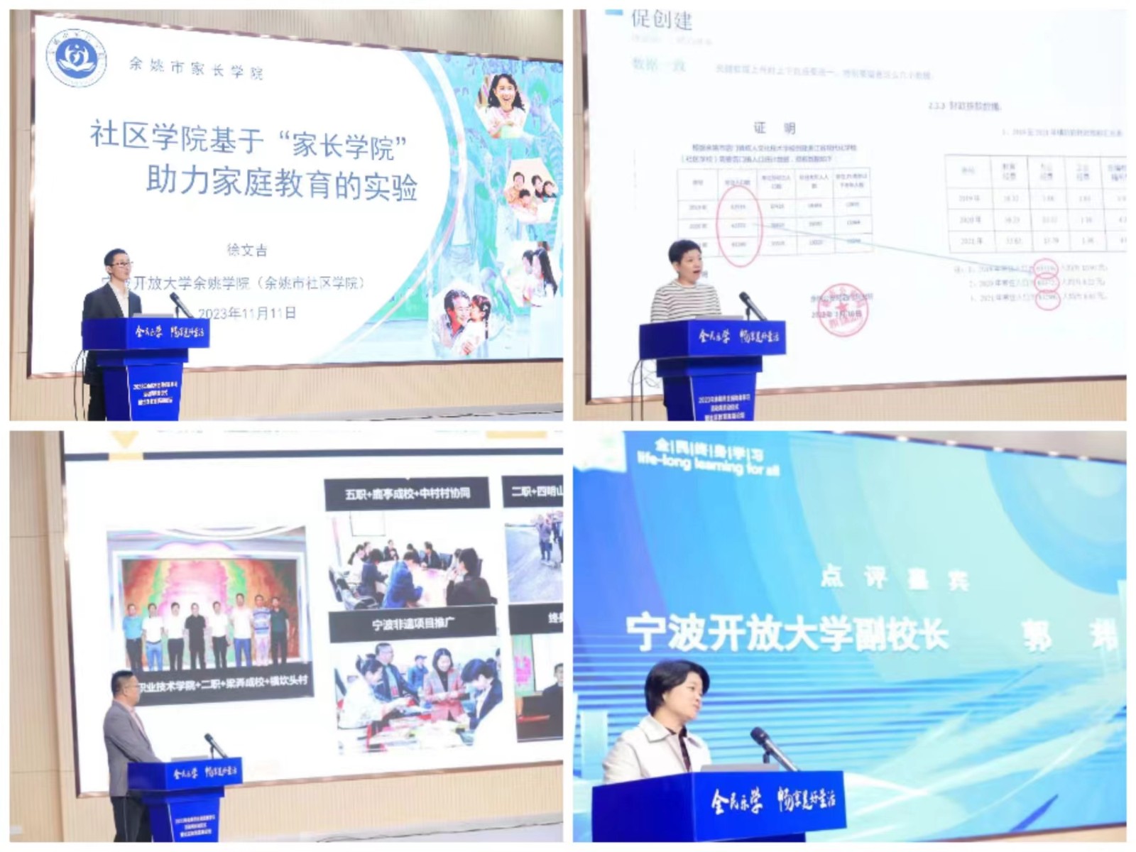 在启动仪式第三阶段——社区教育高端论坛中,梁弄成校陈家铭校长、泗门成校马燕群校长、社区学院徐文吉副校长分别对优秀教师团队建设、省现代化学校创建、余姚市家长学院建设作了发言与分享,宁波开放大学郭玮副校长对论坛内容作精彩点评。
