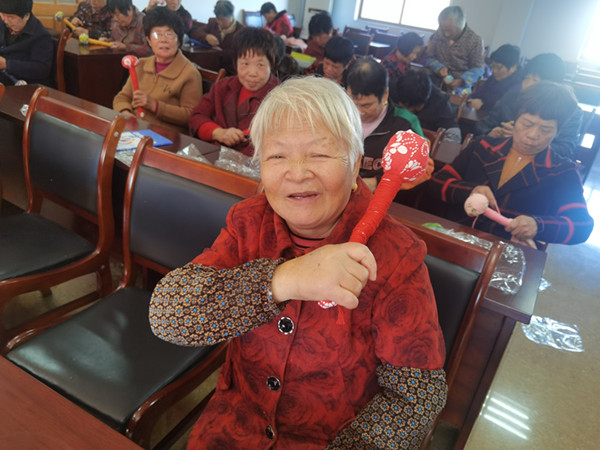 艾草锤可以轻松拍打穴位,利于经脉淤寒、缓解腰酸背痛,具有活血放松、舒经通络等功效。活动伊始,工作人员首先分发制作工具和材料,细致地为大家介绍了艾草锤的养生功效、组成成分及制作方法,示范制作过程。在工作人员和志愿者的带领下,大家首先将支撑棍放置到艾草包中,接着用棉布认真包裹、再仔细用棉线缠绕。老年人一边相互交流、谈笑风生,一边互帮互助地制作艾草锤,现场一片欢声笑语。在逐渐掌握了艾草锤的制作技巧后,很快一个个充满艾草芳香的小锤锤就制好啦!老人们心满意足的互相展示着美丽的成品迫不及待地体验着自己的制作成果,敲敲肩膀,锤锤后背,个个都爱不释手。