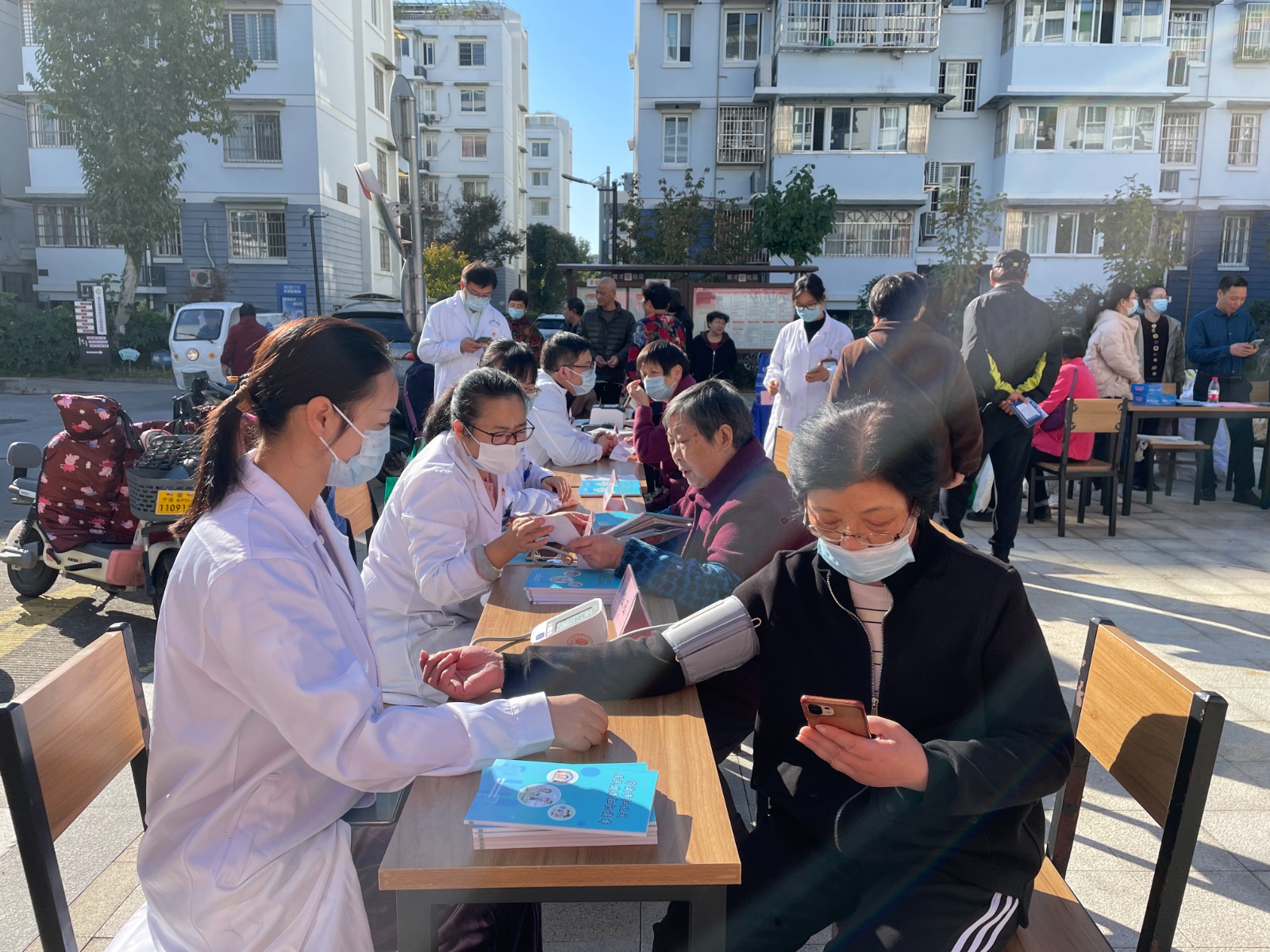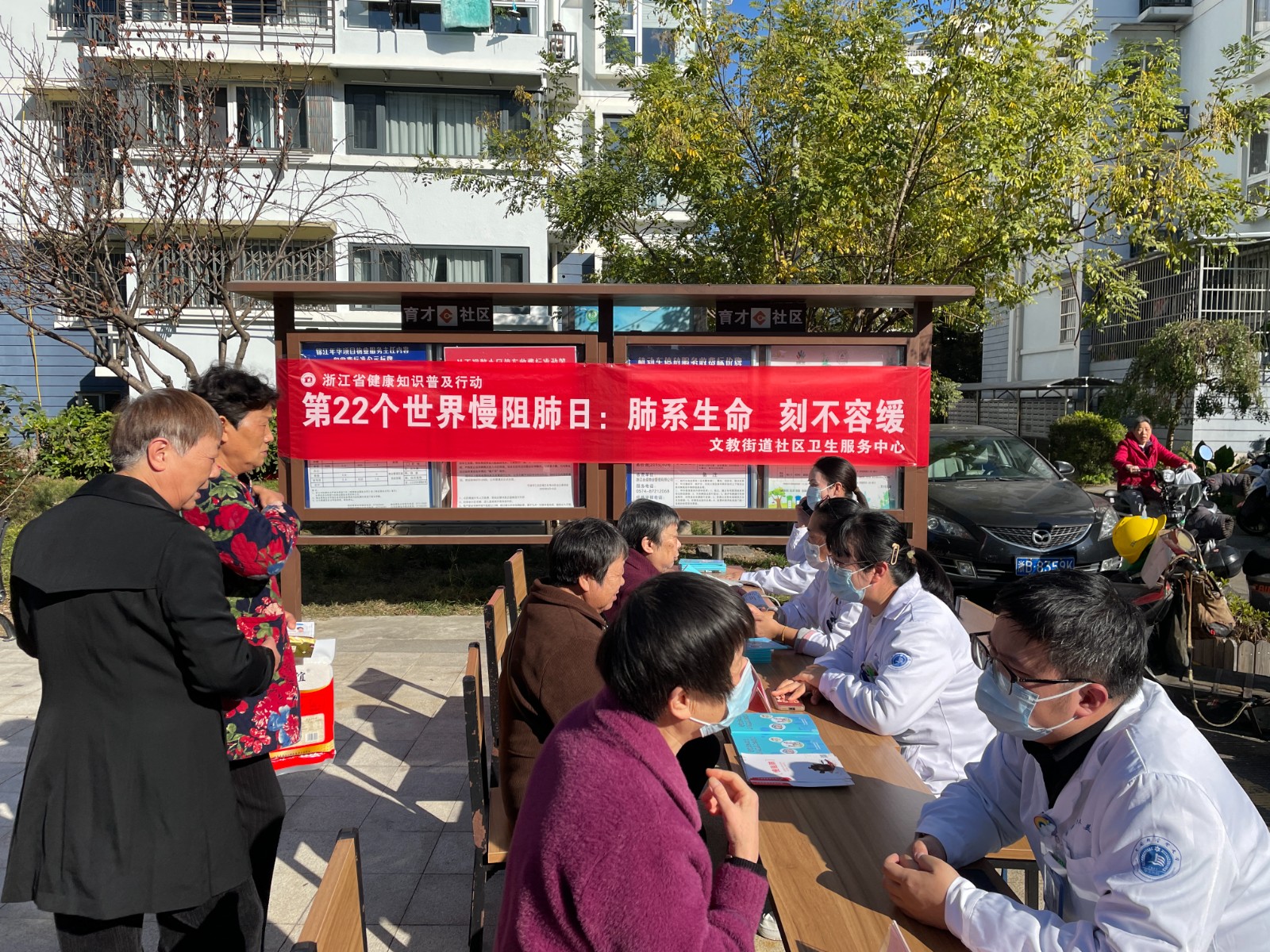 20231115日是今年的世界慢阻肺日,育才社区网格员邀请社区卫生院医生来锦江年华小区进行义诊并宣传慢阻肺知识。