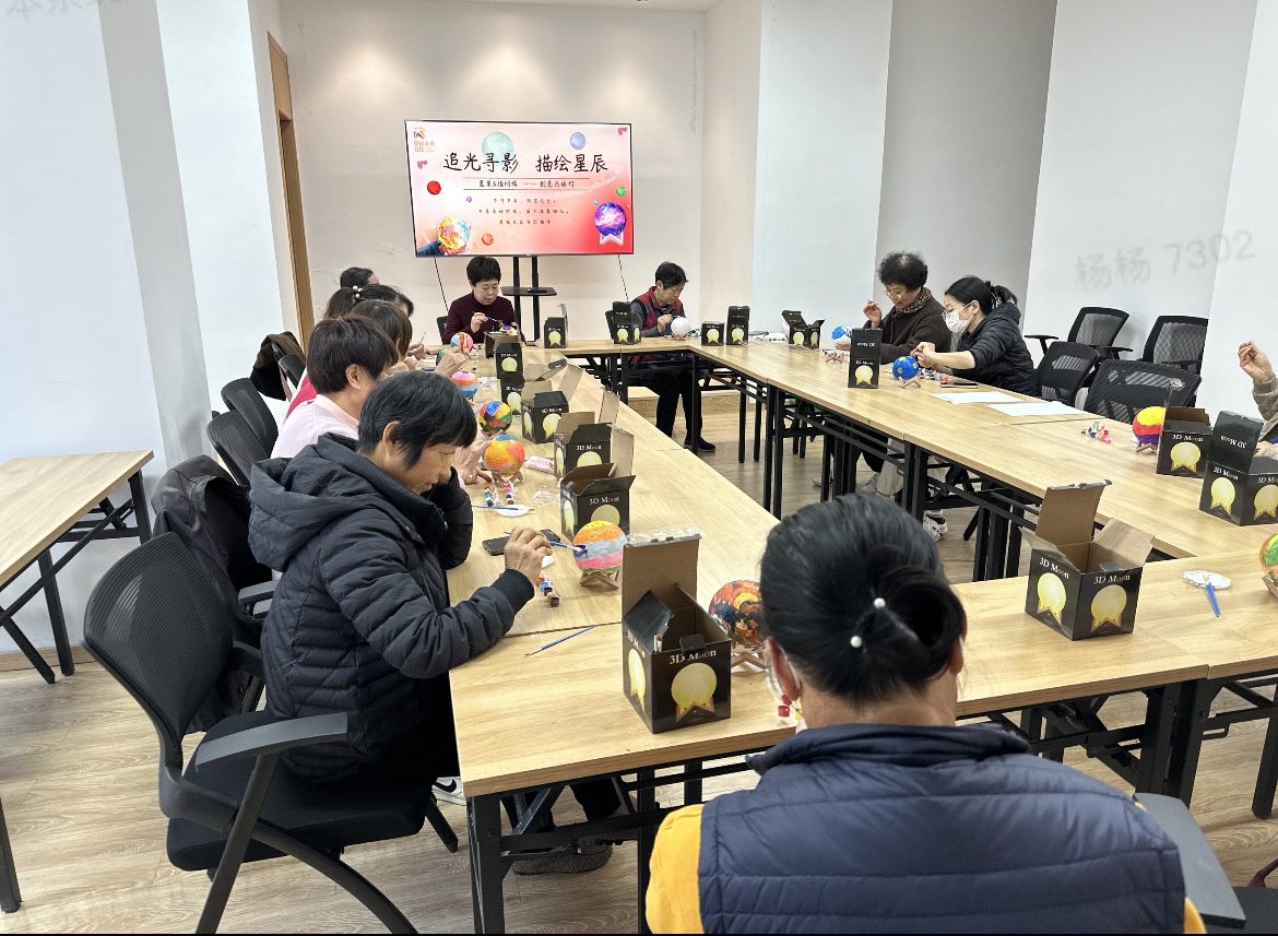 更令人惊喜的是星巢&指尖缘的成员们一起以创意涂色的方式装饰月球灯。大家轻松愉快地交流和交换彼此的创意和灵感。他们用多彩的颜料和细腻的笔触,将原本纯白无瑕的月球灯变成了一个个独具个性、充满艺术气息的作品。这些色彩斑斓的月球灯不仅点亮了社区的夜空,更寓意着星巢&指尖缘这个社团的多元化和独特性。