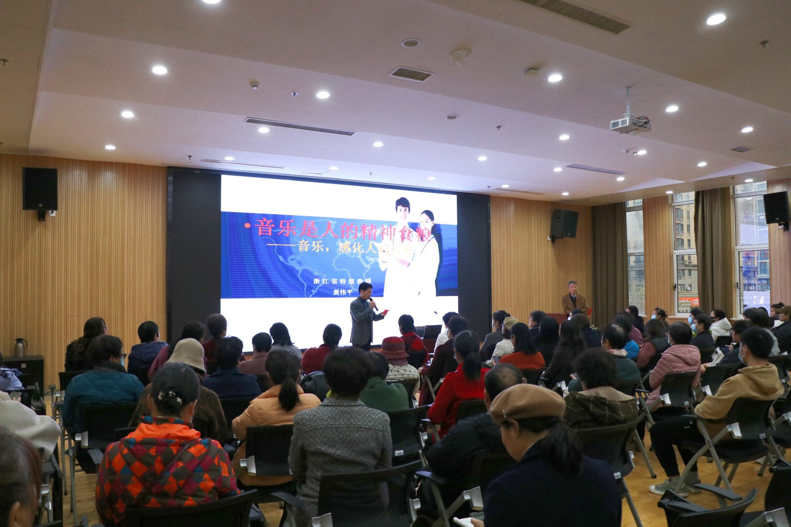 1215上午高新区社区学院成功举行美育大讲堂”第——《如何欣赏交响乐》。此次讲座邀请了浙江省特级教师黄伟平主讲辖区内近100人到场聆听。大家一同沉浸在交响乐盛宴中。