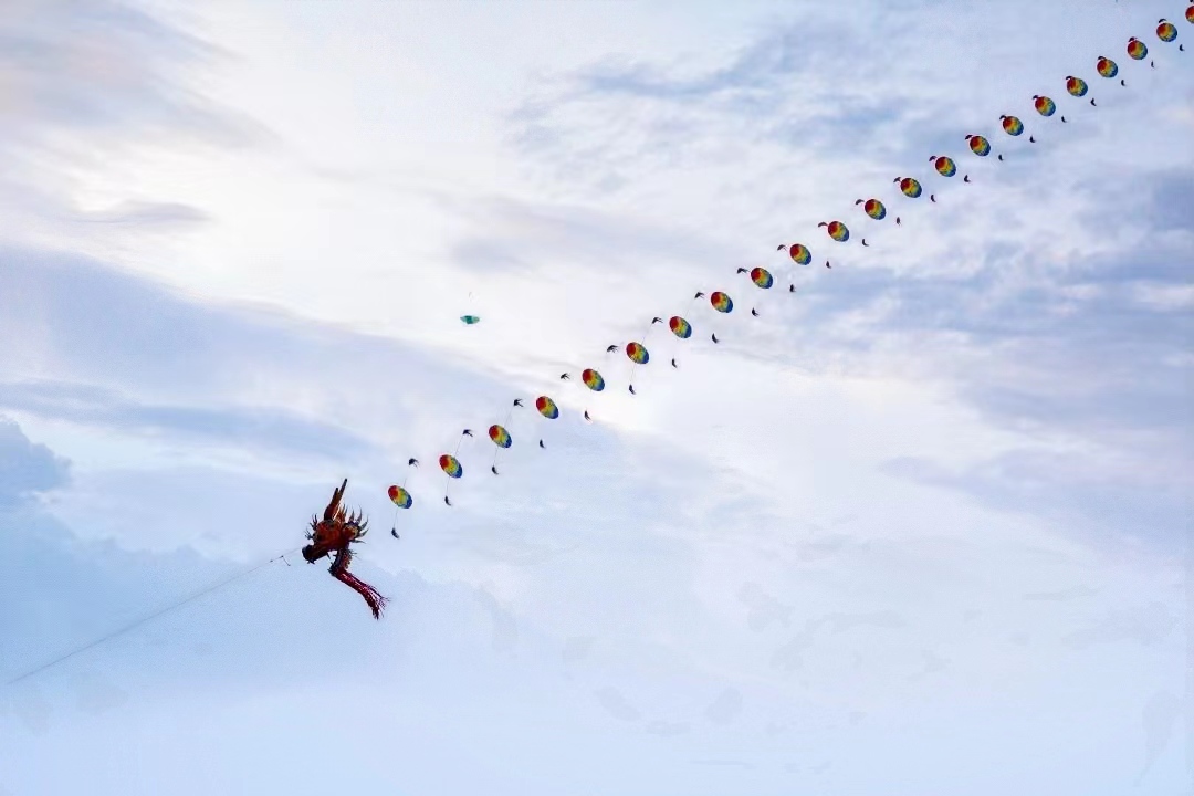 比赛现场,选手们一个个紧握风筝线,放线、平衡、调整、控制,相互提醒,致力配合,确保成功放飞。比赛正式开始后,选手们迫不及待地放飞手中的风筝,软体的、乌贼的、螃蟹的、龙身的、海豚的......一时间,天空上色彩鲜艳、形态各异的风筝争奇斗艳、翱翔蓝天......
