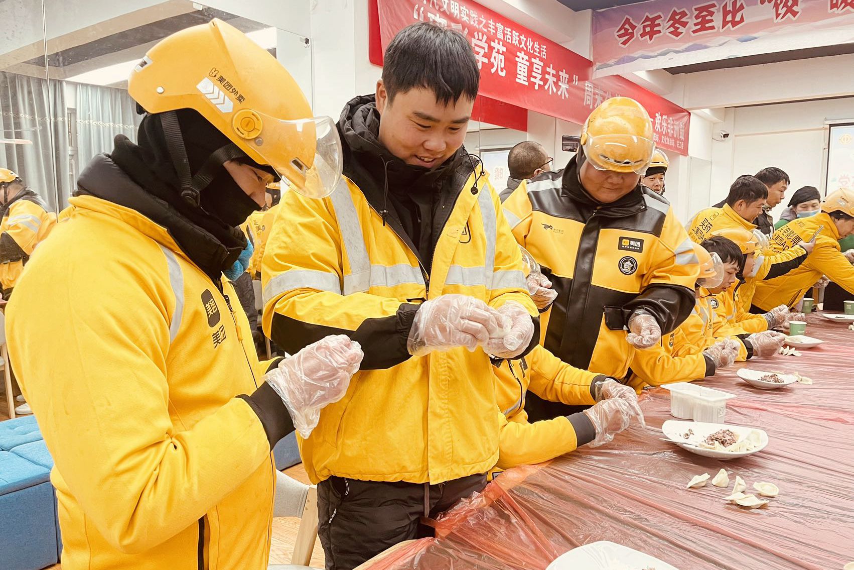来自五湖四海的外卖小哥们聚集在一起,鲜艳的黄色外卖服在灯光下格外醒目。为让穿梭在风里雨里的外卖小哥们也能感受到家的温暖,让他们在欢乐、祥和的氛围中迎接冬至的到来,学苑社区商圈工会、文化加油站和新时代文明实践站组织了这场包饺子、吃饺子活动,与这些新就业群体共同渡过一个美好的下午。