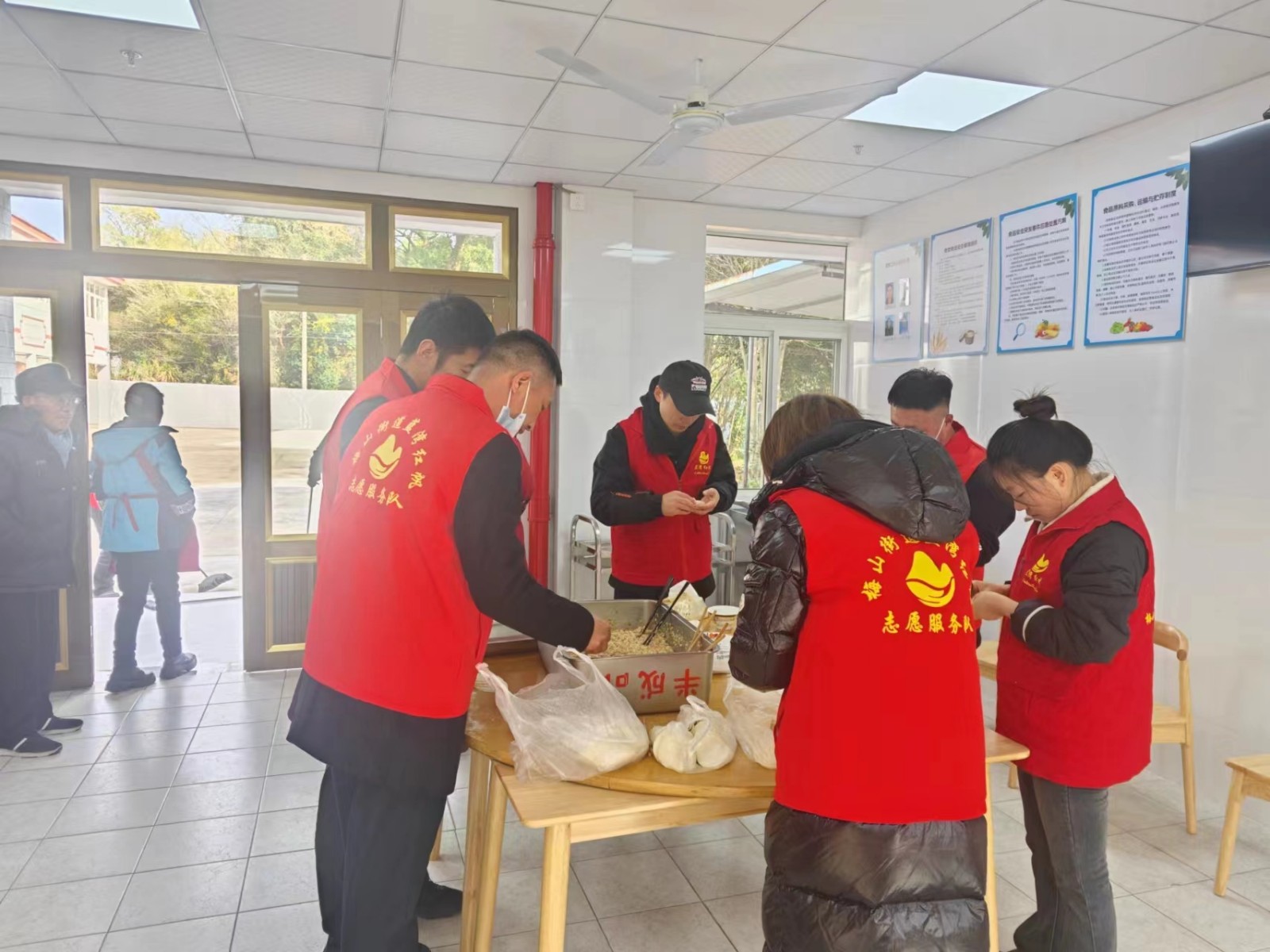 一大早,来自极氪梅山工厂的10余名志愿者就带着面、肉、牛奶、水果等食材来到梅山敬老院,马不停蹄的投入到紧张的工作中。他们分工明确,有的和面,有的调馅,有的擀皮,有的负责包,配合非常默契。