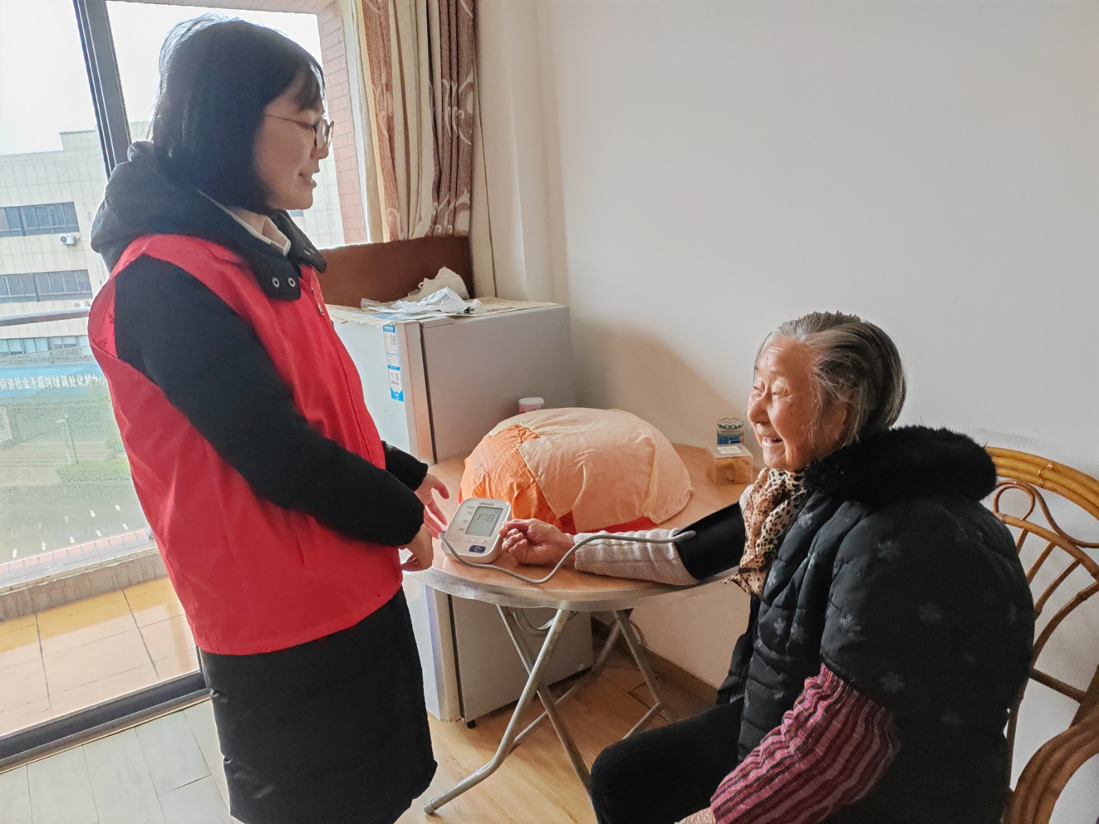 寒潮预警发布,气温骤降,老人的身体最容易受到影响。19日下午江梅社区的网格员们来到绿岛新城小区中,挨家挨户地敲门,给老人们送温暖上门守护安康。进门后,网格员们先对老人进行了血压测量,在测量的同时仔细询问了当天的血压和用药情况,并耐心嘱咐要及时添衣,外出要注意安全,有任何困难找居委会。之后又仔细查看他们的房屋安全、取暖措施,宣传普及日常用电、用火以及防寒防冻注意事项。对于独居的老人,网格员们还特地提醒老人子女、家属及时关心探望老人。