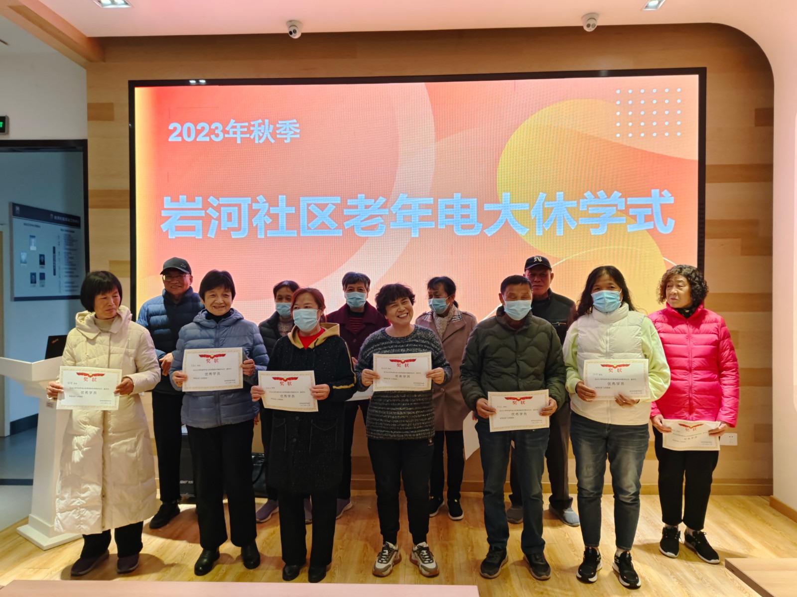 近日,岩河社区举行了2023年老年电大秋季班休学仪式,30余名学员欢聚一堂,在紧张的考试中结束了本学期的学习。随后,岩河社区老年协会会长虞维华为老年电大秋季班的“优秀学员”和“学习积极分子”进行了颁奖,并鼓励学员们继续积极参加明年老年电大的春季班。