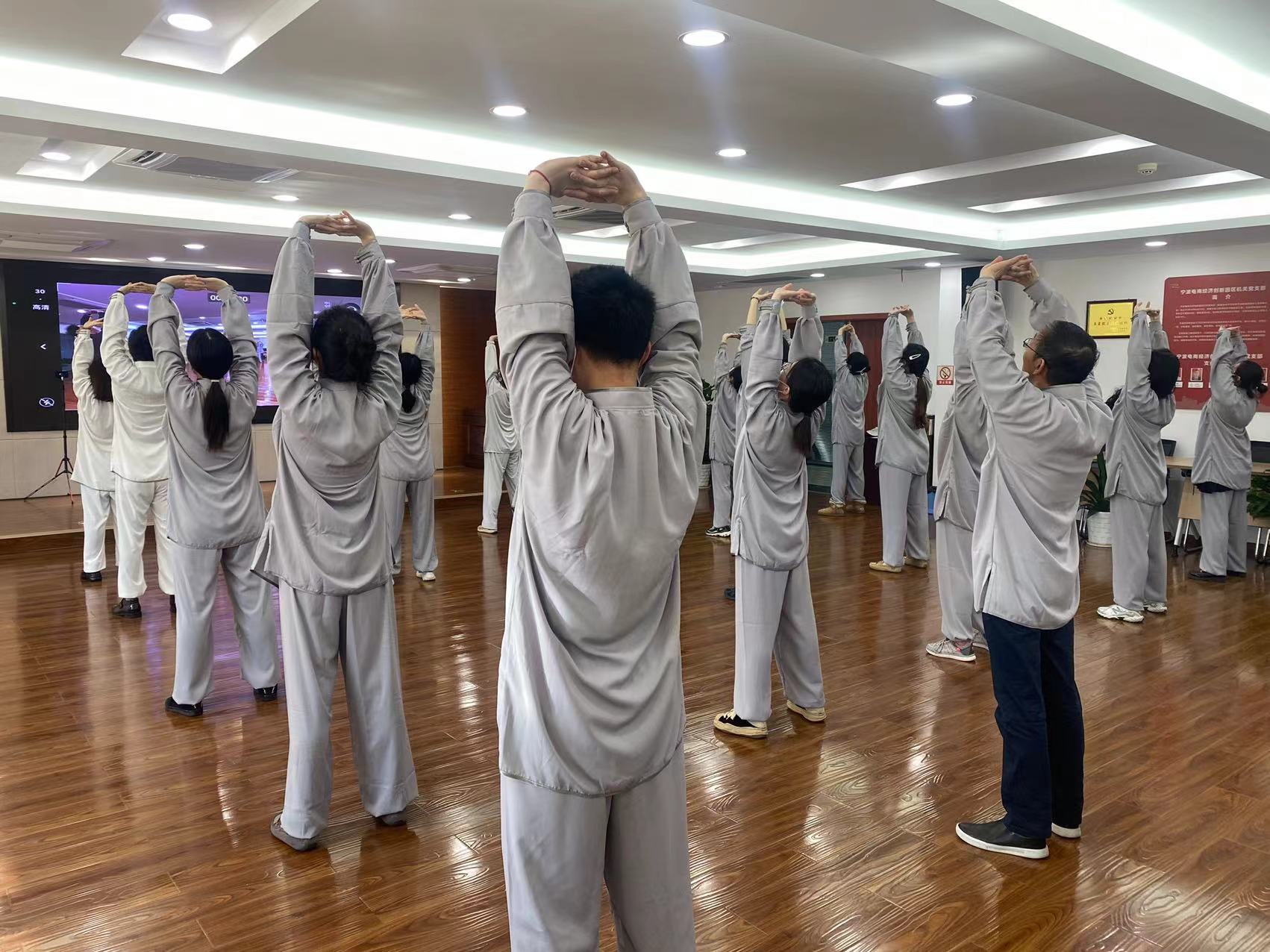 老师先带领大家进行了简单的热身运动,随后,便与职工们一起开启“八段锦”的基础入门训练。并向大家示范基本动作要领,耐心地将每一个动作步法、手形及手法逐一进行分解教学。本次课程共教学了四个动作,学员们学习得都很认真,听讲得很仔细,动作做的都比较到位。
