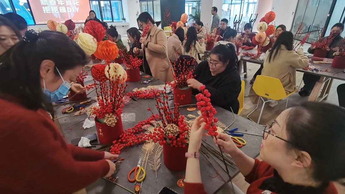 随后老师手把手教职工们学习手插银柳,红色大气的福桶、细长喜庆的银柳、金色的银杏叶,还为福桶挂上招财猫、龙字挂件等各式各样红彤彤的装饰品。渐渐地,在大家的巧手下,一个个具有独特魅力的花艺作品呈现在大家眼前,现场充满了浓浓的新年氛围。