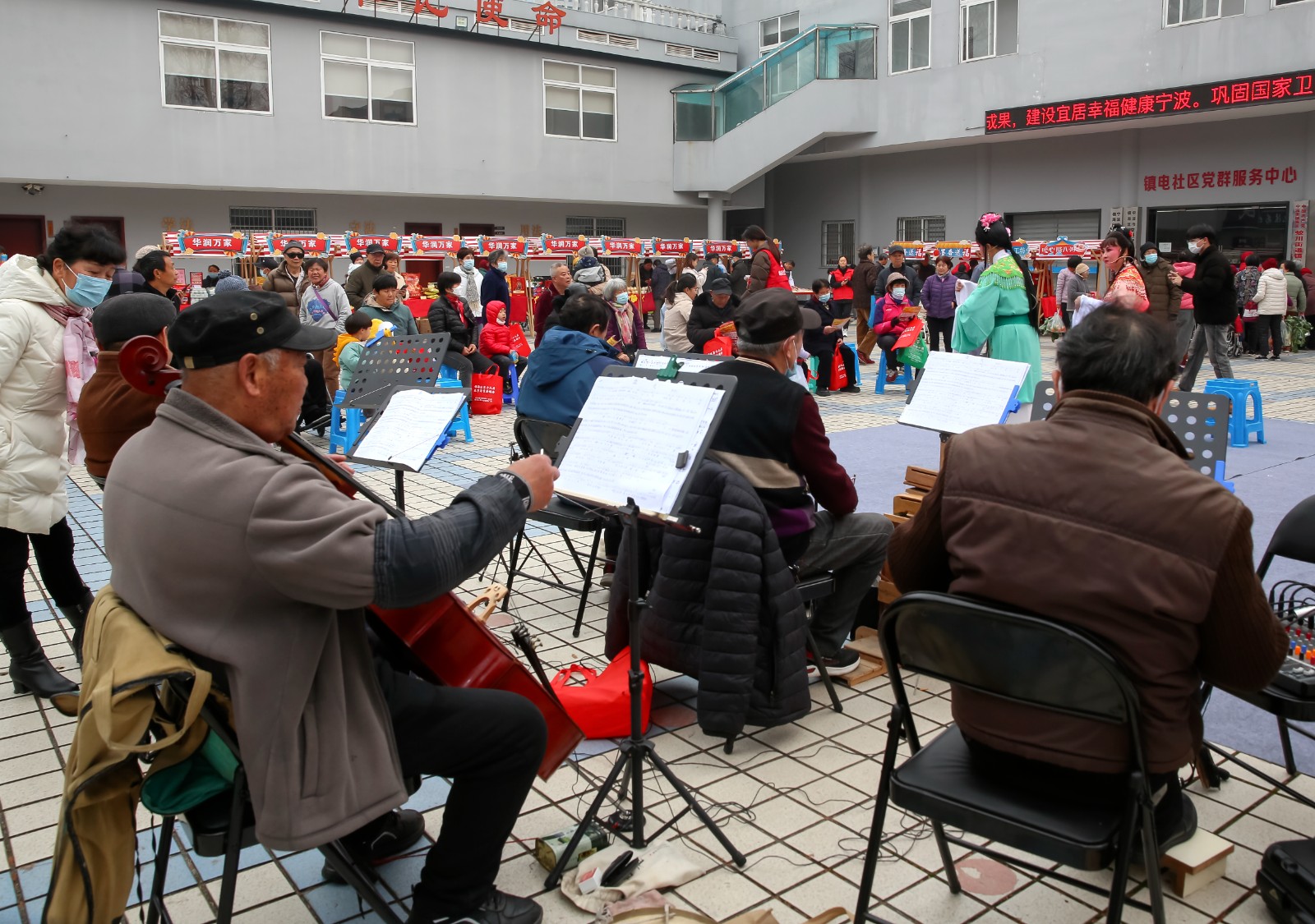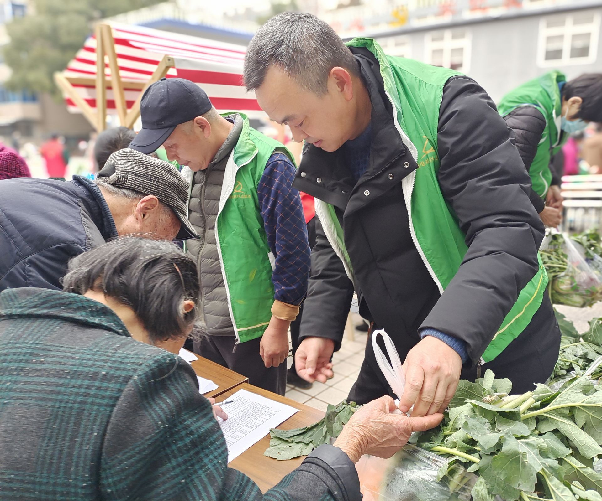 活动现场设立“小菜园爱心菜”、“暖心腊八粥”、“别样红手工坊”、“墨香送福”、“华润万家年货摊”、“折子戏专场”等志愿服务摊位。活动伊始,小菜园爱心菜的摊位前就排起了长队,社区80周岁以上老年居民纷纷来到摊位前,领取爱心蔬菜包。为了把菜园里最新鲜的菜带给社区老人,社区锄禾志愿者们从昨天开始收菜、净菜,结合小区菜鸟驿站提供的爱心水果,一起分装打包,别样红女红坊的志愿者用了一周时间赶做了100个福字扭扭棒,一起送福给老人。“两只手都快拿不下了,我们社区真是越来越好了。”罗阿姨开心地说。
