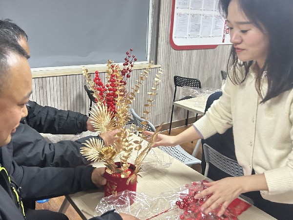 活动中, 书记强调党员要时刻保持清醒头脑和忧患意识,遵规守纪,严于律己切实做到知行合一。随后社工介绍年宵福桶的制作流程和步骤,强调了制作过程中的注意事项,并将材料包分发给了大家。拿到材料包以后,党员们便开始着手做起来。大家相互讨论,精心搭配,每个人的脸上洋溢着幸福的笑容现场气氛热烈融洽。不一会儿,一盆盆别出心裁的年宵花福桶便展现在大家面前。党员们根据自己的想法在祝福卡片上写上新年祝愿以及初心寄语,并将其挂在做好的年宵花上进行装饰一张张翩翩起舞的新年卡片点缀在喜庆红火的年宵花上,不仅让传统的“年味”更加浓郁,也传递了浓厚的“党味”。