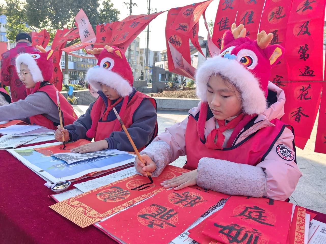 “龙腾虎跃庆佳节 鸟语花香迎新春”“梅传东信寒冬去 竹报平安好日来”。春联的红色映出吉祥幸福,毛笔字散发着墨香,1月17日一大早,来自柴桥小学的同学们戴着喜庆的龙头帽在老师的带领下准时来到街心公园现场泼墨挥毫,为大家书写一张张带着新春祝福的春联。