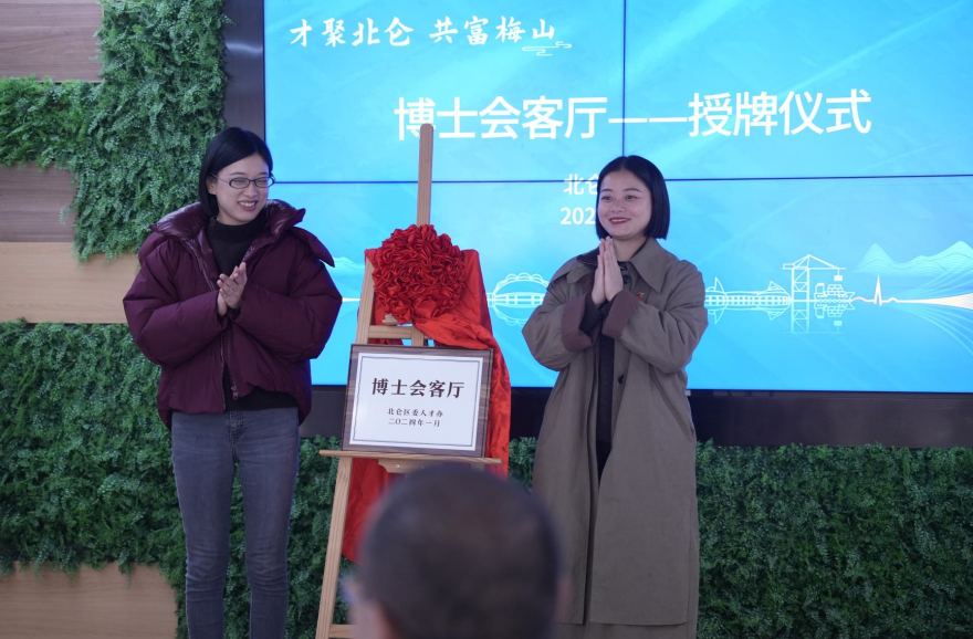 授牌仪式上,北仑区委人才办副主任陆颖尔与金创工业社区党委书记顾赟赟一同为“博士会客厅”揭牌。梅山街道党工委委员顾宏辉致辞,他表示梅山将始终重视、关心、支持博士联谊会的工作,一如既往地礼敬人才、厚待人才、激励人才、服务人才,为人才在梅山演绎精彩提供更大舞台、实现出彩打造更广平台、赢得喝彩提供更好擂台。此外,来自北航宁波创新研究院的博士代表——聂瑞以“人才经纪人”项目为例分享了自己的工作经历,对梅山街道及金创工业社区为人才服务所作的工作致谢。