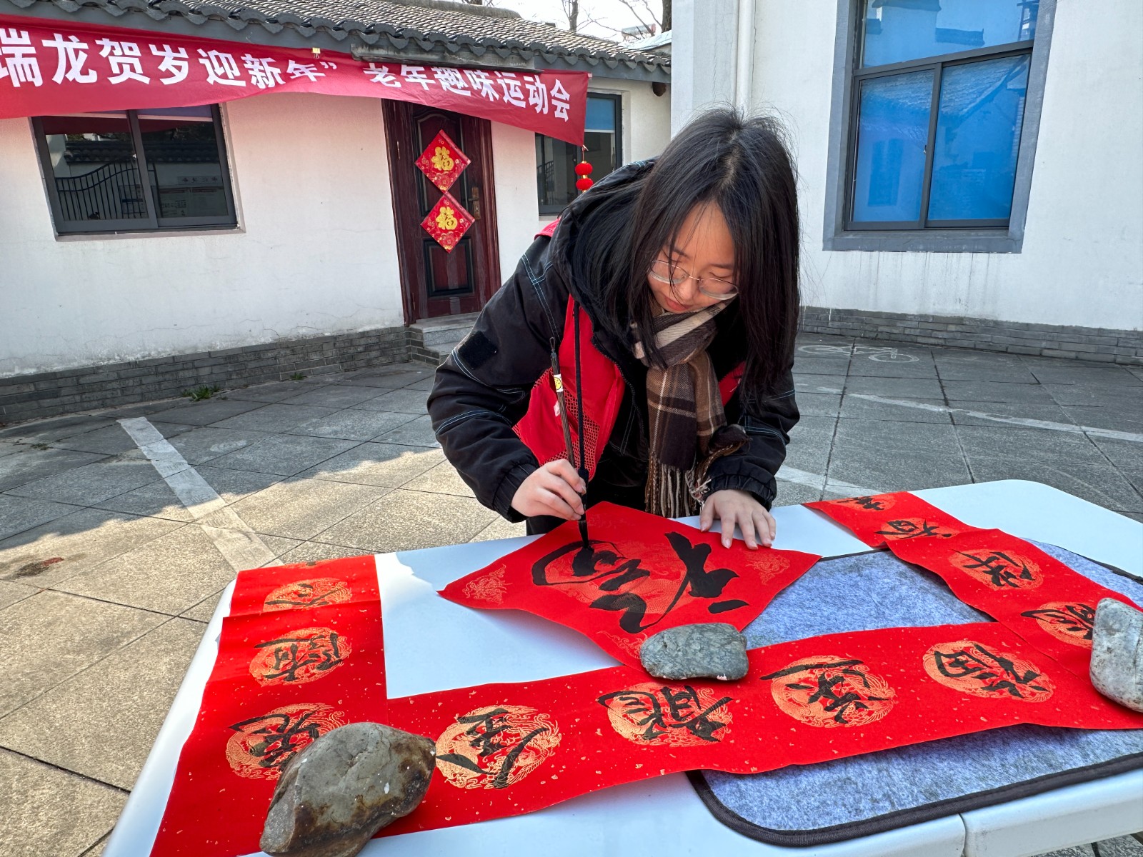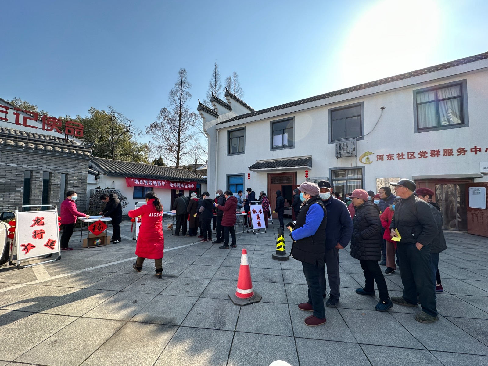 下午两点在河东社区大院内,老年居民们有序排队等待领取参与活动的入场券,活动开始前社区工作人员向居民们积极进行反诈宣传,强调年关将至警惕电信诈骗,守护好“钱袋子”.活动现场共设置三道游戏关卡,第一道为幸运龙珠,由乒乓球拍托运乒乓球,十米路障S弯道大闯关。完成第一关的居民可顺利进入第二道龙行大运环节,由羽毛球拍做推送工具,进行皮球输送进篮筐的闯关。完成两轮游戏的居民可进入第三道画龙点睛的环节,十米距离蒙眼点睛。三道关卡全部完成可移步至书法专区,请社区志愿者帮忙撰写新春祝福,参与讲祝福语领取新春福字,并根据游戏积分领取不同奖品。