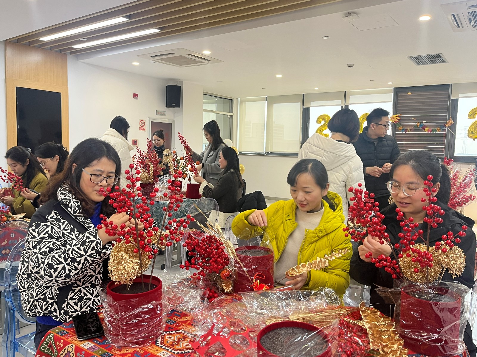 “Wow,so beautiful ......””龙年行大运......新年快....乐......”2月2日,梅山成校教学点金创工业社区内传出一阵阵欢声笑语,时不时传出几句英语和不太熟练地中文。这里正在进行“花”式迎新年 把福‘抱’回家”迎新春福桶自制活动,来自宁波大学梅山校区、北航宁波研究院、、梅东码头公司、梅山海事处、北京大学海洋药物研究院等企事业单位的职工、海内外留学生围坐一堂,热热闹闹地学习插花,制作新春“福桶”。