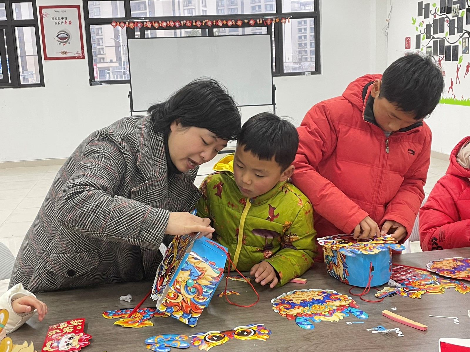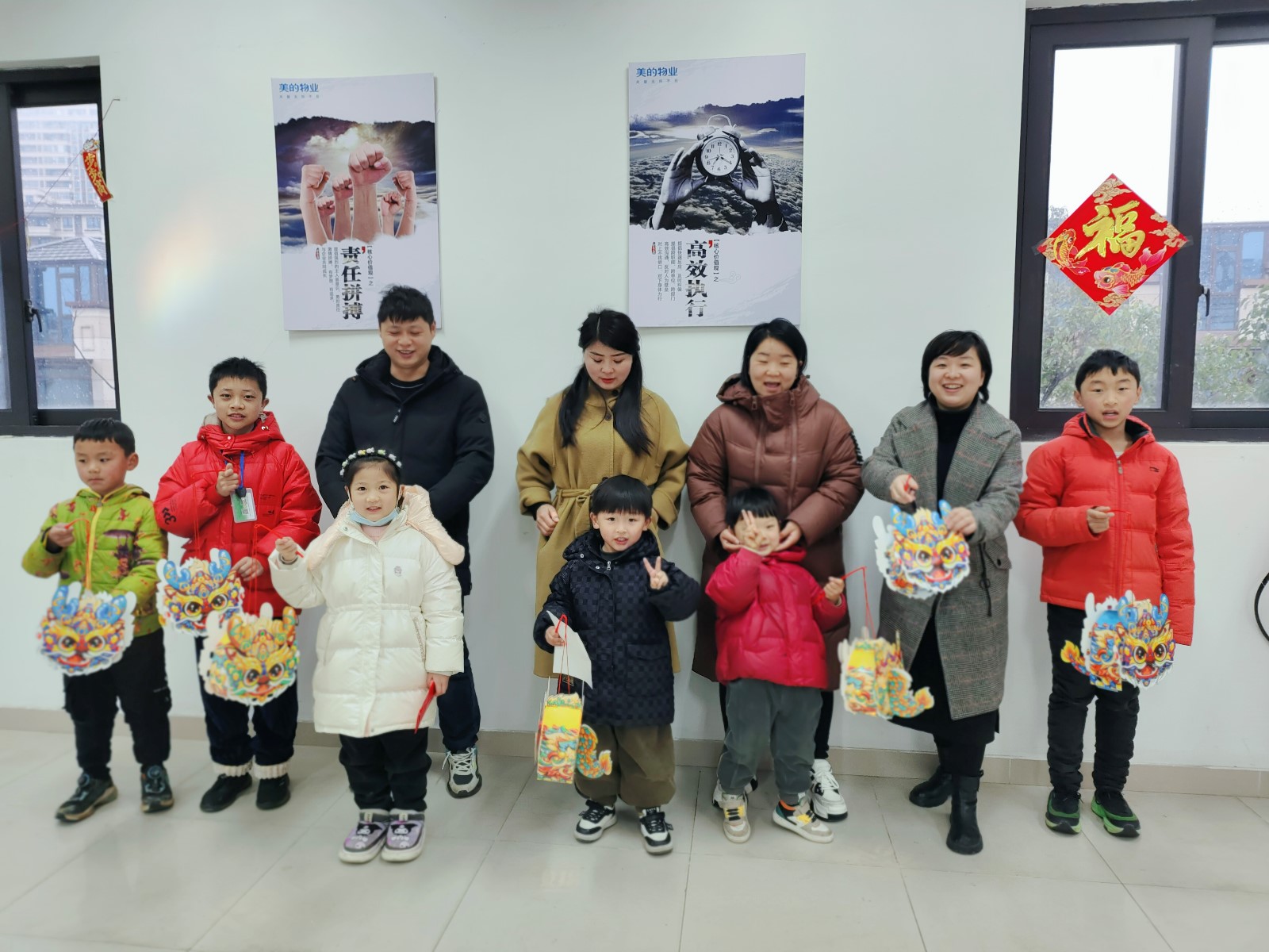 除了广场上的公益摊位,楼上亲子活动区还有小朋友喜欢的节目。爸爸妈妈和小朋友们一起将可可爱爱的卡通小龙串成一串,挂到窗户上,一起把龙年的祝福贴在玻璃上,自己动手布置的场地氛围感立刻拉满,小朋友们满满的成就感。这还不够,一起来猜幼儿版的灯谜,一起来听听元宵节的故事,一起来做一个萌哒哒的可爱小龙灯,亲子区的节目一个接一个,小朋友们忙的不亦乐乎。
