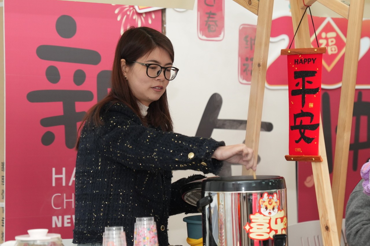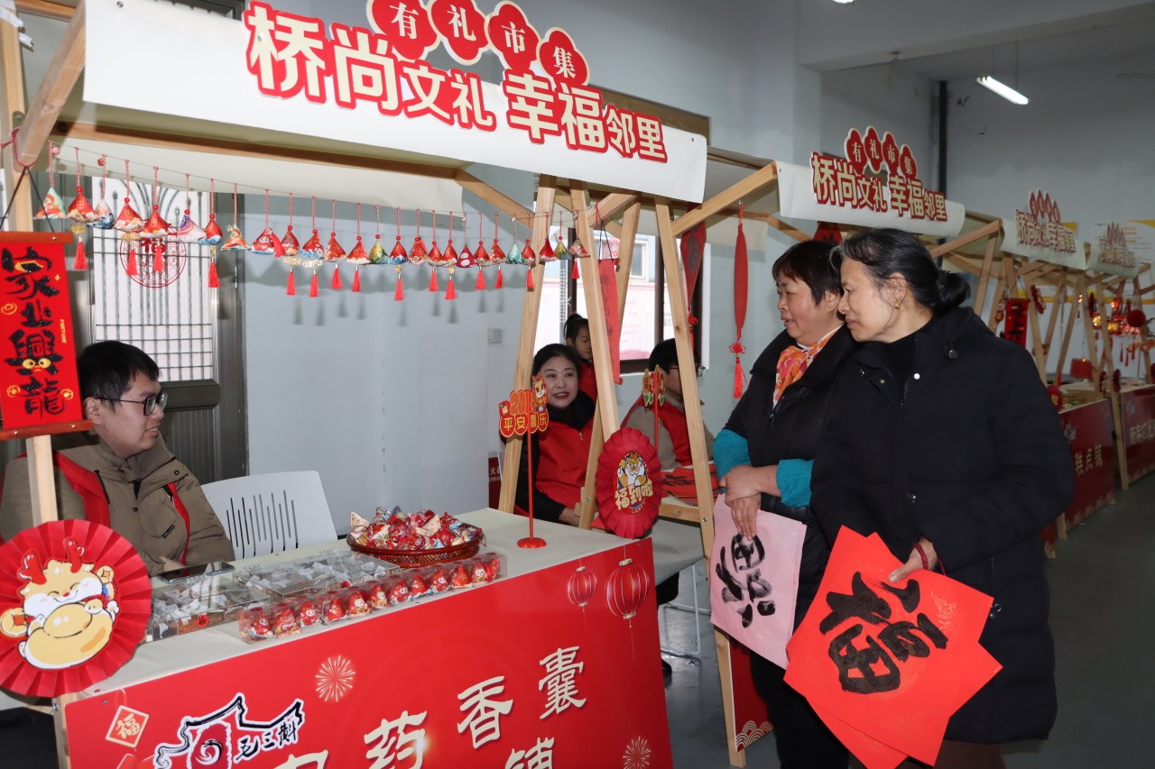 中午时分,文化礼堂内已是人声鼎沸,一楼的“桥尚文礼 幸福邻里”有礼市集和农家书屋内,各种好吃好玩的小玩意儿琳琅满目,红色春联带着墨香阵阵,大家逛市集、领福字,喜气洋洋;二楼幸福厨房内包汤圆烘焙传统民俗活动热火朝天。