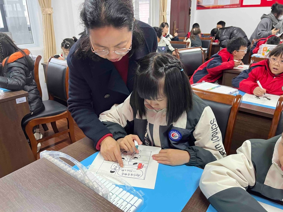 在活动现场,农民画画家朱碧云引导小画师们先进行思考再来进行设计构图。选择画面内容时思考生活中有哪些不安全行为,例如,不遵守交通规则随意横穿马路、不懂消防知识随意玩火等。并提醒同学们需要增强自我保护能力,提高安全防范意识的行为,比如,远离网络暴力、校园欺凌等。让同学们在绘画中选择一些不遵守安全规则的行为进行指正。
