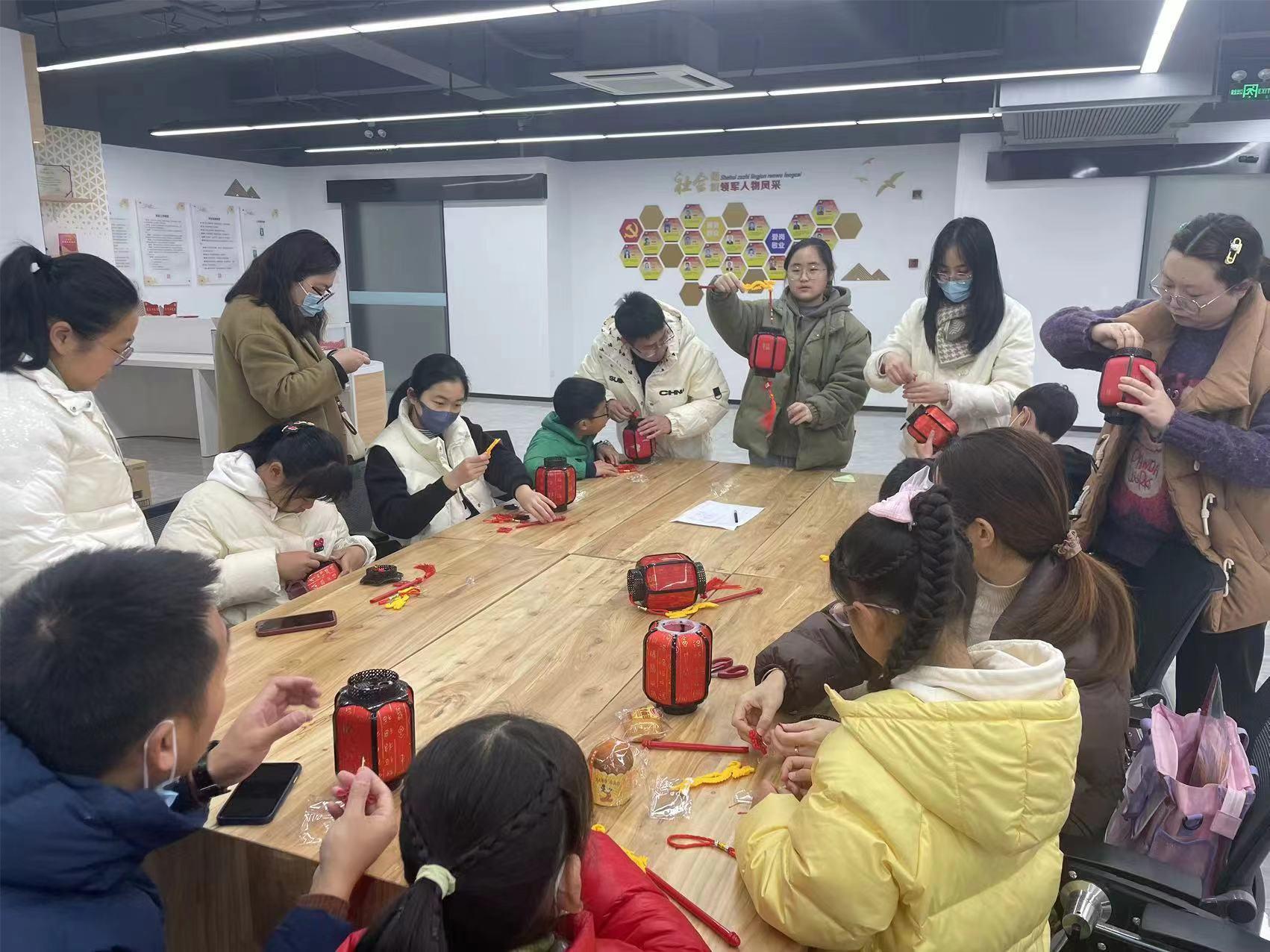 活动在天沁社区分区域举行,中老年人在小教室,青少年及部分家长在大厅区域。中老年居民一边做花灯一边拉家常,青少年及家长们则讲着学校的趣事,享受着美好的亲子制作灯笼的时光。