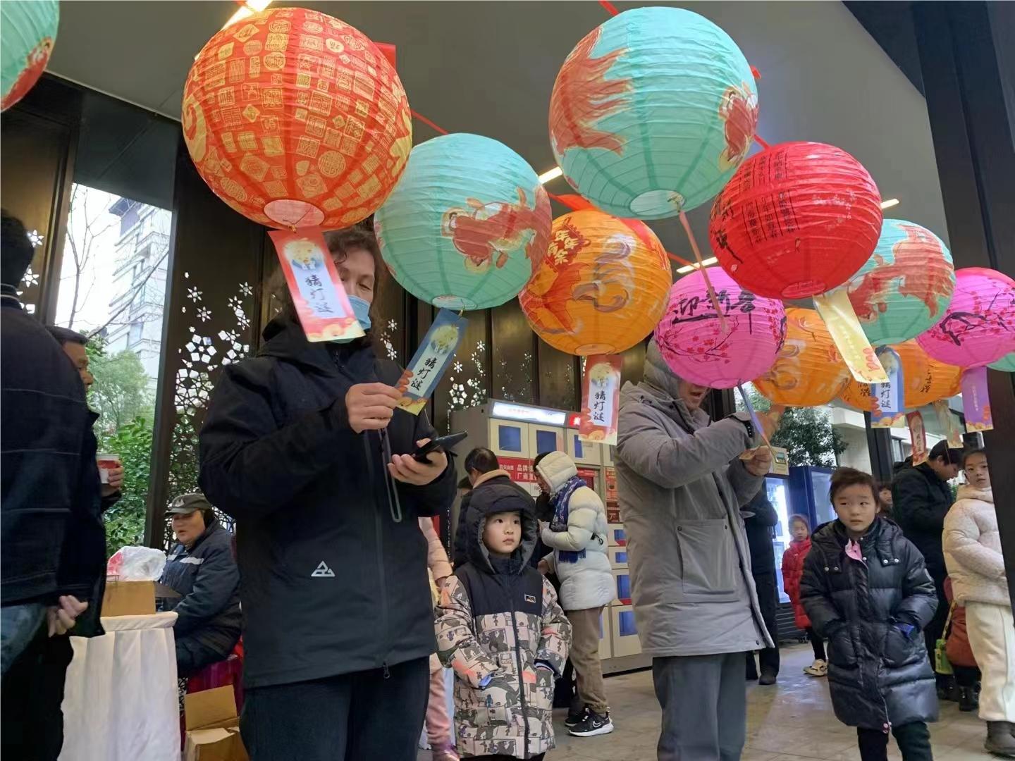 “太阳西边下,月儿东边挂——猜一字答案是啥?”“是 ‘明’,‘明’亮的‘明’,对不对?”“真聪明,小朋友,这个卡通灯笼送给你啦!”“男女老少赏花灯,其乐融融庆佳节——打一节日。”“元宵节!”“对啦!”元宵节当天,庄桥街道天沁社区在枫华里小区中庭开展了一场热热闹闹的主题为“祥龙迎春到,喜乐闹元宵”元宵节新春集市活动,让社区居民过一个热闹祥和的元宵节、充分享受节日的浓厚气氛,同时促进邻里情谊,增进社区的凝聚力和和谐度。