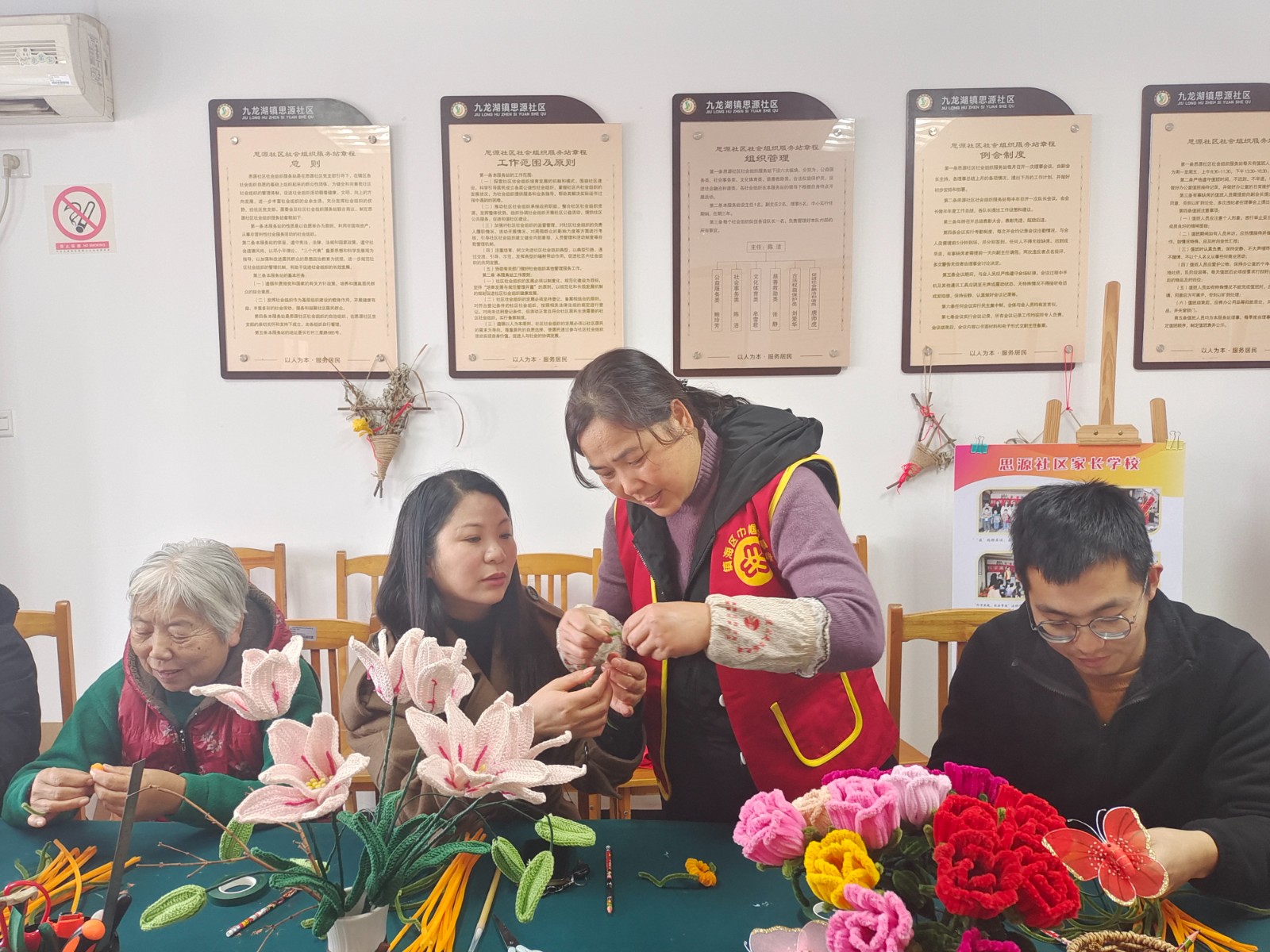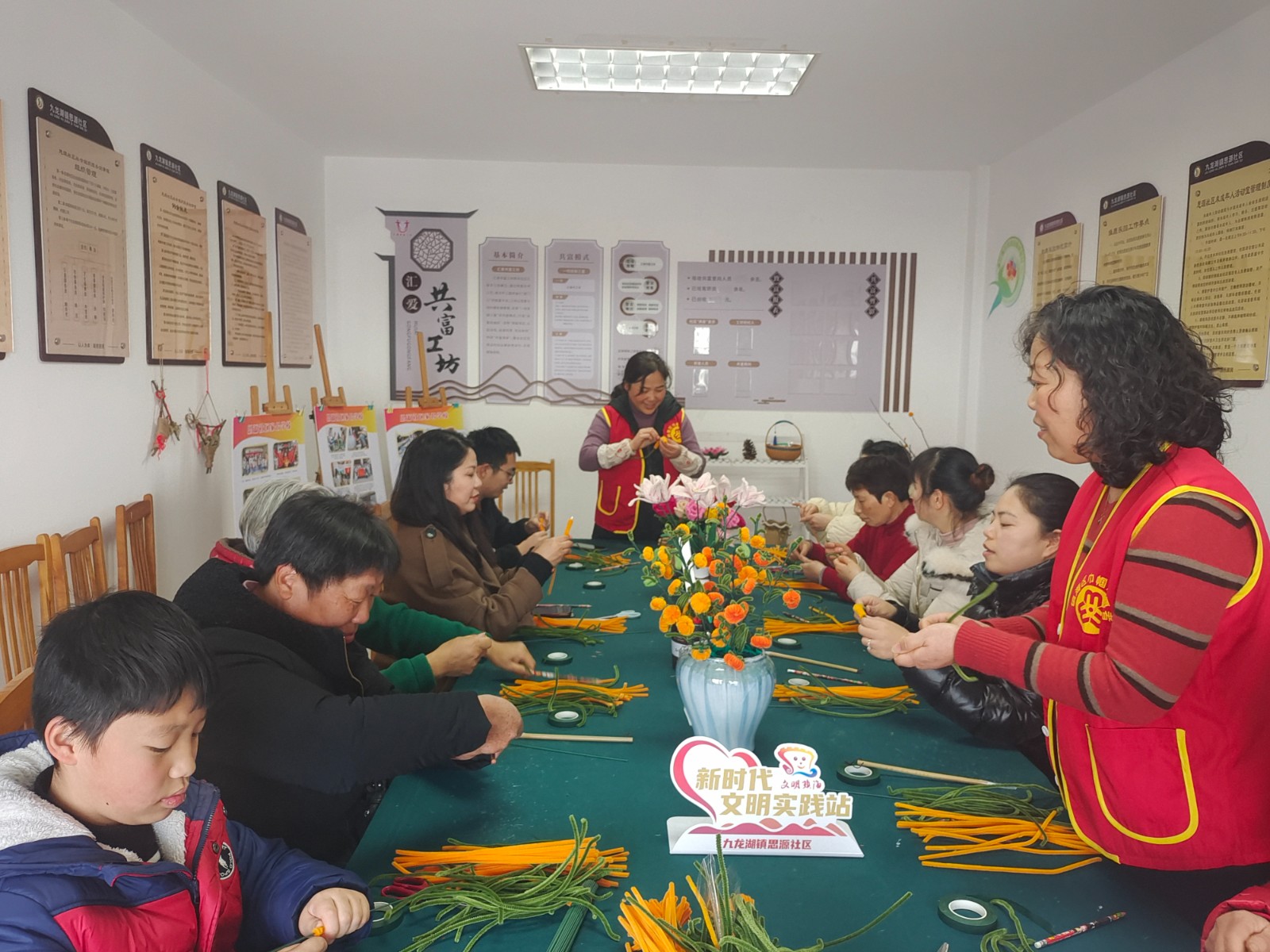 为丰富社区老年人的精神文化生活,在体验民俗之趣中提高居民的动手能力,思源社区汇爱共富工坊开展“‘扭扭’新花样,‘柿柿’皆如意”扭扭棒DIY手工活动。由执委刘爱华向大家展示了“柿柿”如意扭扭棒花束成品,栩栩如生的“柿子花”瞬间吸引了大家的目光。
