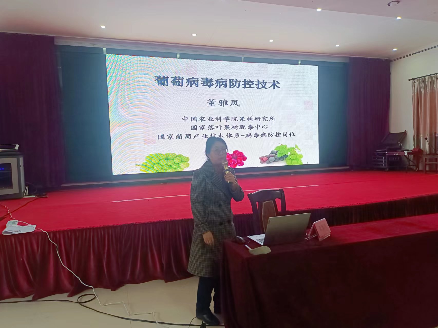 接着由中国农科院岗位科学家、国家葡萄产业技术体系病虫害防控研究室的董雅凤教授带来葡萄病毒病防控技术》的专题讲座。她分析道:葡萄病毒病是一种非常严重的病害,在葡萄的种植过程中非常常见,患上病毒病,症状明显,会大大降低葡萄的产量及品质。不同的葡萄品种之间对病毒病的抗性存在着一定的差异,应尽可能选用抗性较强的品种。加强科学的田间管理,增强其抗病抗逆能力,及时清园,采取措施,及时使用各种药剂,钝化病毒。