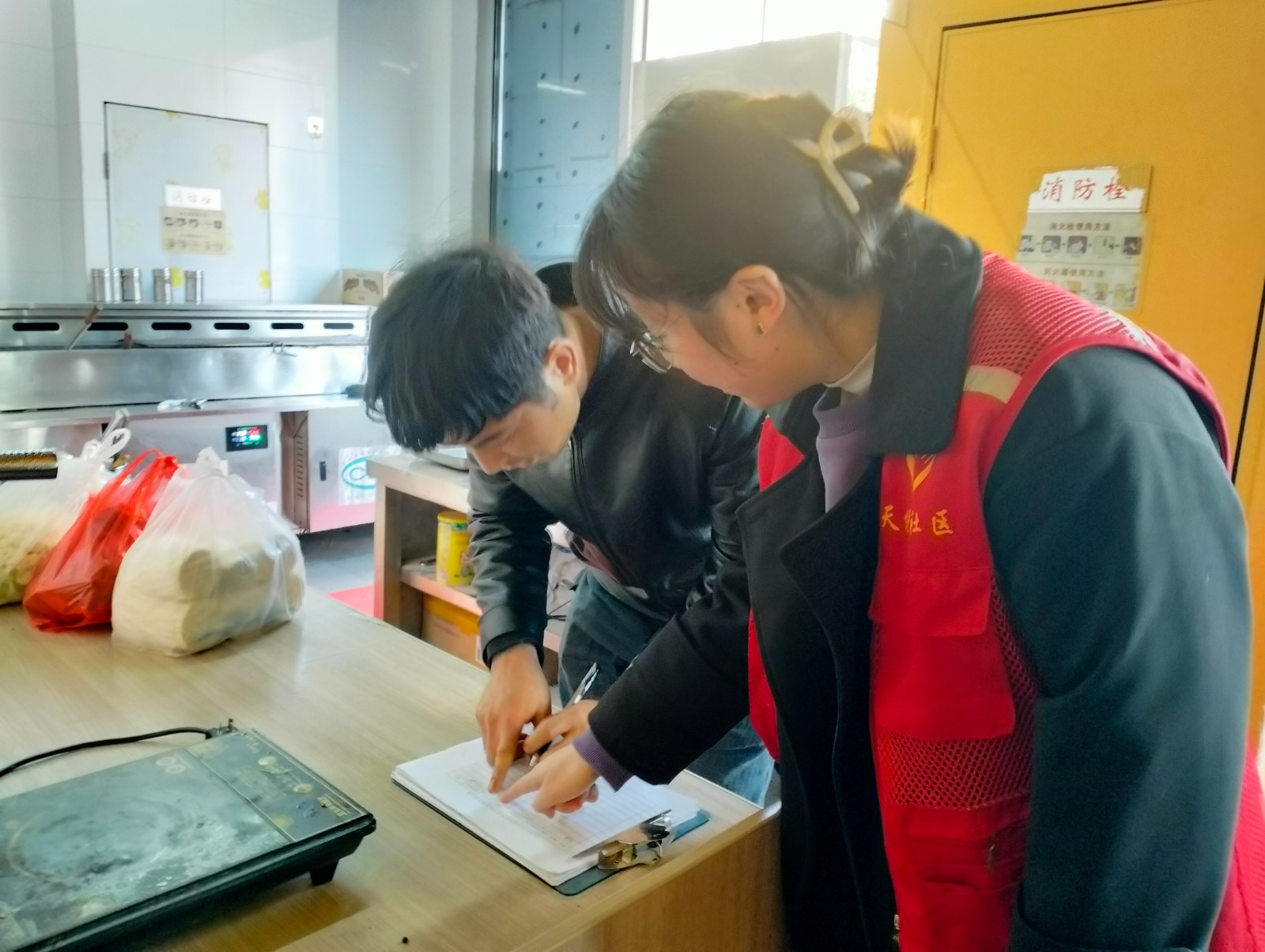 大学生志愿者小应则跟着“网格员师父”小俞来到辖区内的餐饮店铺开始安全消防检查走访工作。店铺虽小,需要关注的问题却很多,是否存在乱拉电线、是否有违规住人、店铺证件是否齐全等等。在“师父”的带领下,小应上手很快,一整套流程从陌生到熟悉,最后还总结出一套自己的走访方式。