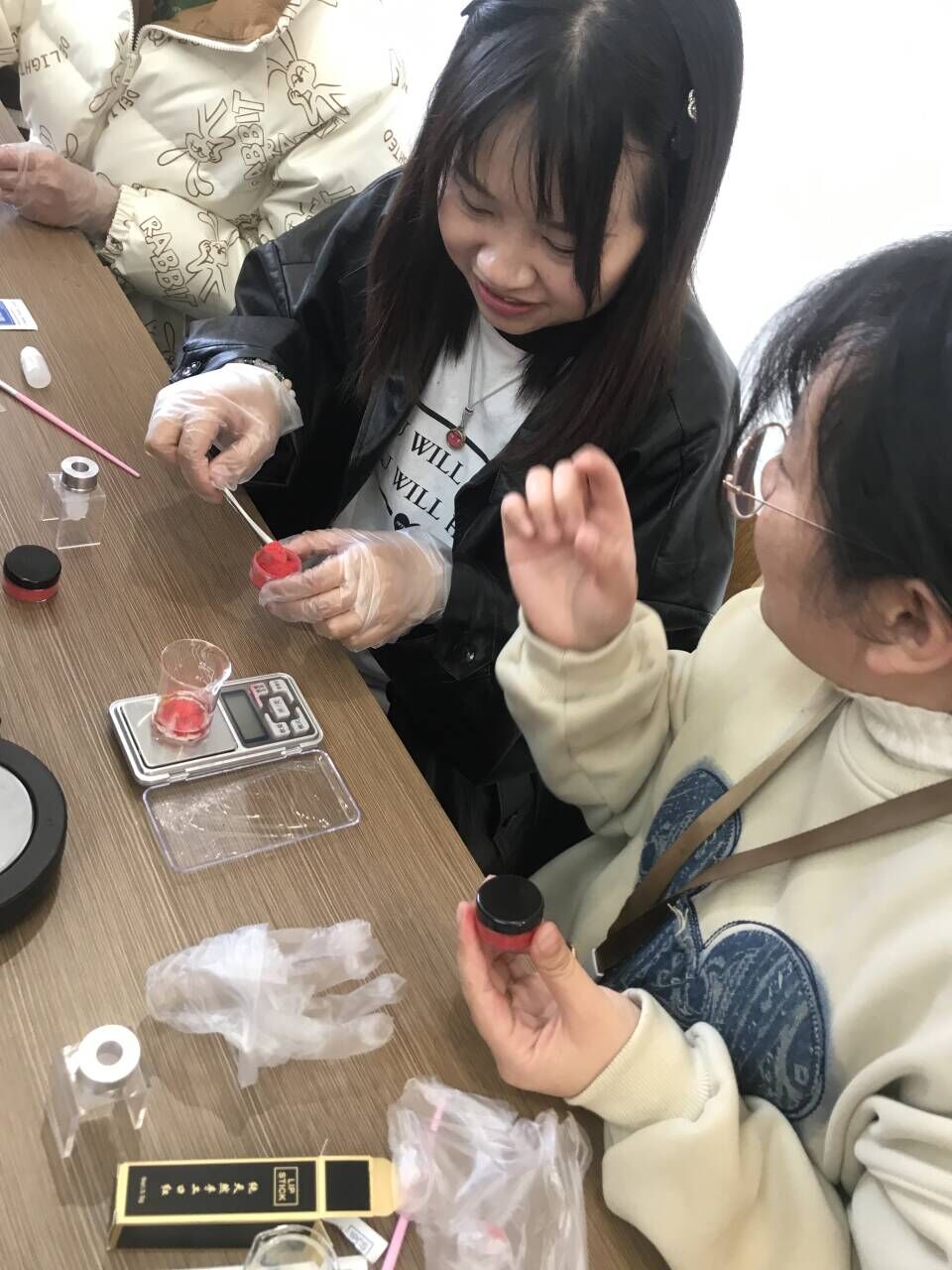 当看到自己亲手制作的润唇膏和口红成形并脱模成功后,学员们开心极了