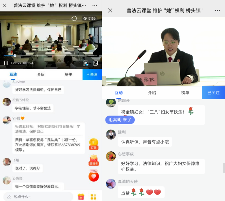 我们通过镇里的社会治理平台“群治分”小程序发起线上预告,直播开始前报名观看就有2000多人,这次结合三八妇女节推出的普法课堂是我们普法栏目《里仁桥头讲法律》的特别企划,也是“建设法治浙江 巾帼在行动”普法乡村行的有益实践,给广大妇女法律普及维护妇女权益方面法律法规,让她们能有效的保护自己。”桥头司法所工作人员说。