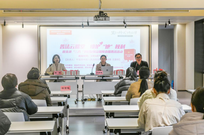 为让广大妇女能正确有效地维护自身权益,由慈溪市司法局、慈溪市普法办主办,由桥头司法所联合桥头镇妇联、桥头镇总工会、桥头成校、慈溪法院横河法庭承办,在三八节来临之际,开设普法课堂,此次授课通过现场+“云”直播方式共同授课,由桥头镇妇联邀请各村妇女主任和妇女代表现场听课,并通过网络直播形式向全社会直播。