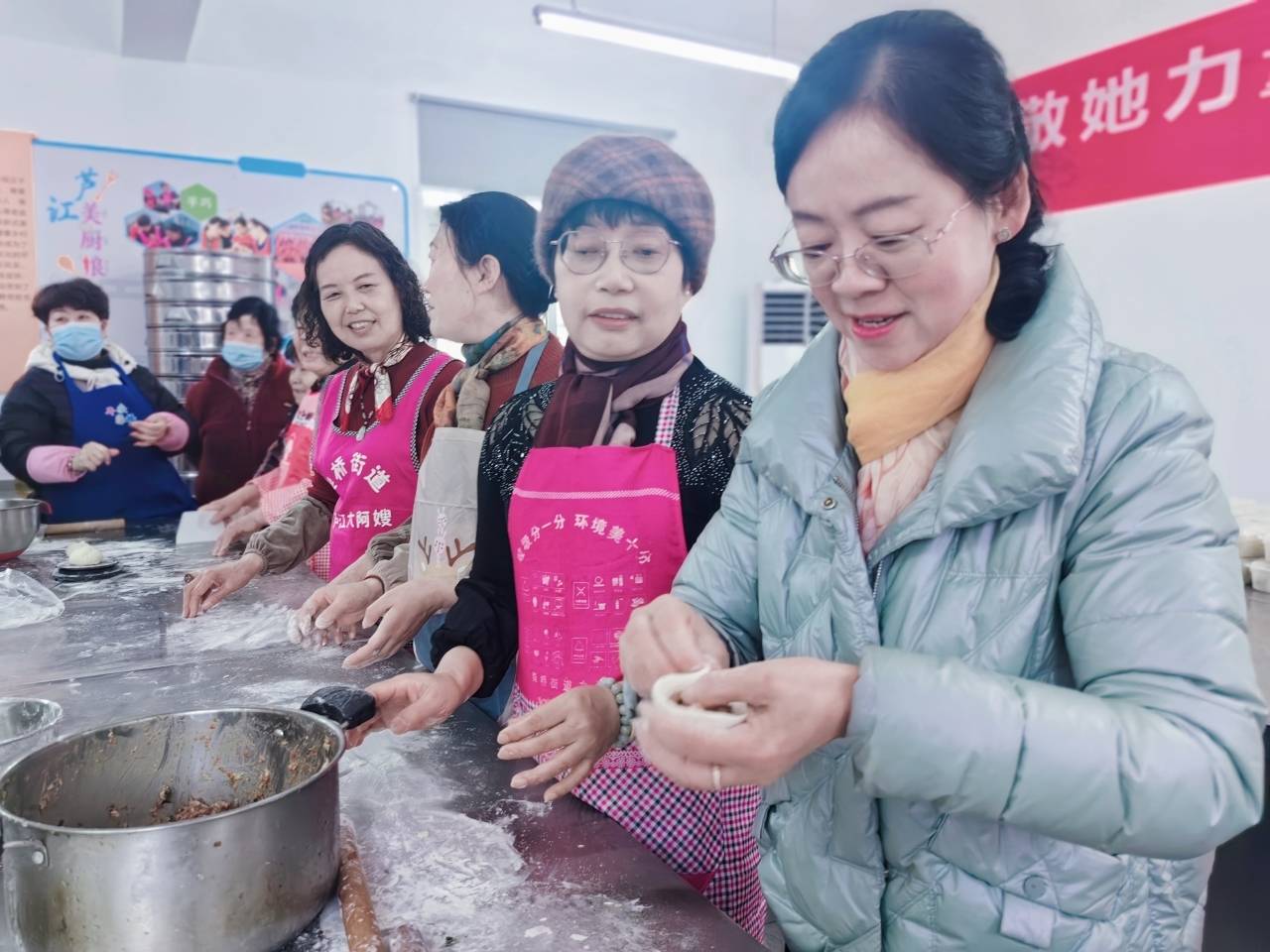 一大早,巾帼志愿者的阿姨们就张罗起来,准备肉馅、揉面、发面,准备就绪,大家分好组开始包包子,有的拌肉馅,有的擀面皮,有的包包子,忙的不亦乐乎。