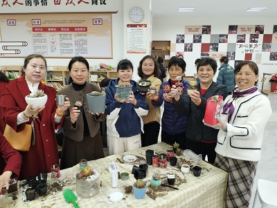 “这个是装鸡蛋的小竹筐,这个是外卖塑料盒,我把它俩搭配在一起,加上这几株精美小巧的多肉,组合起来挺不错的吧。”“我照着网上的教学视频,拿废旧的洗衣液瓶子裁剪出来了一个花盆,既达到了资源循环使用的目的,也扮靓了我们的家。”来自铂悦府小区的阿姨们各自分享着劳动成果。大家挑选自己满意的多肉,去除根部的杂土,再在盆内重新填上营养土,将修根后的多肉种植进去,再盖上一层石子,最后一盆盆精美的多肉被整齐地摆放出来。