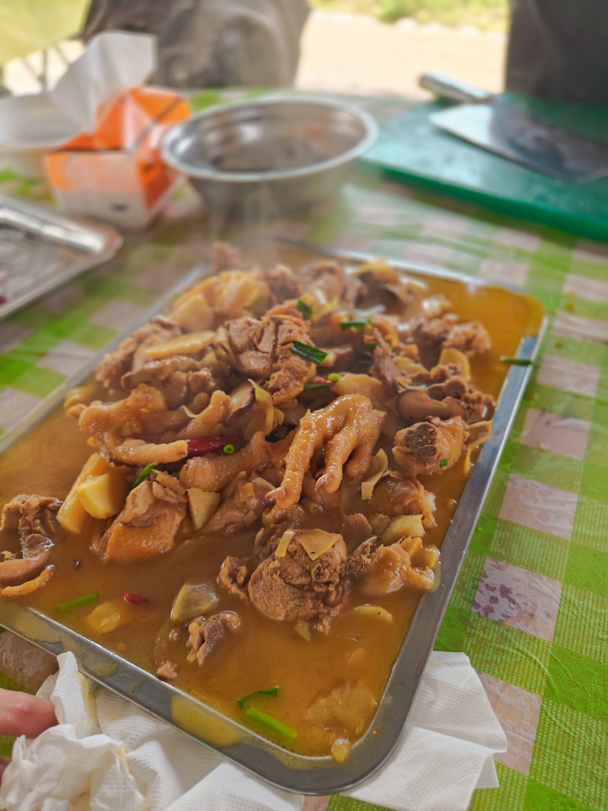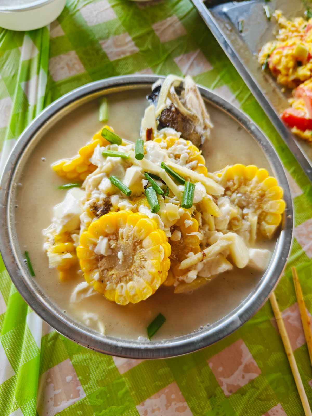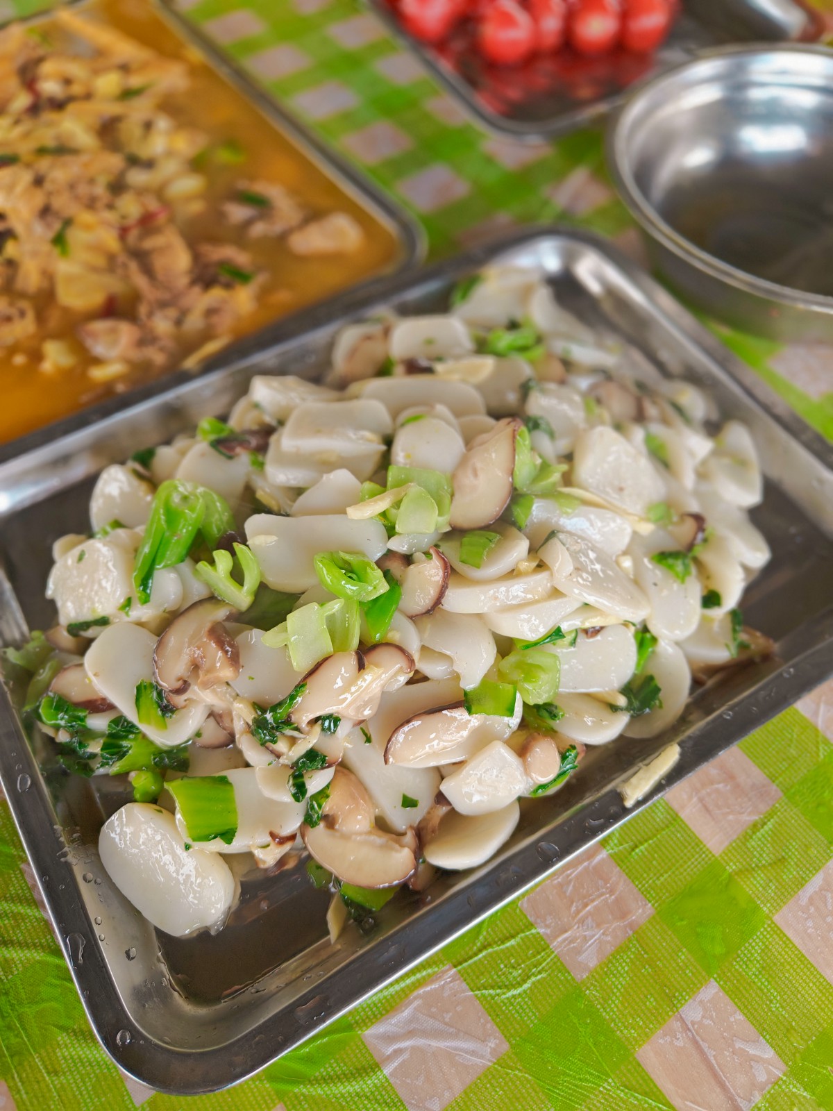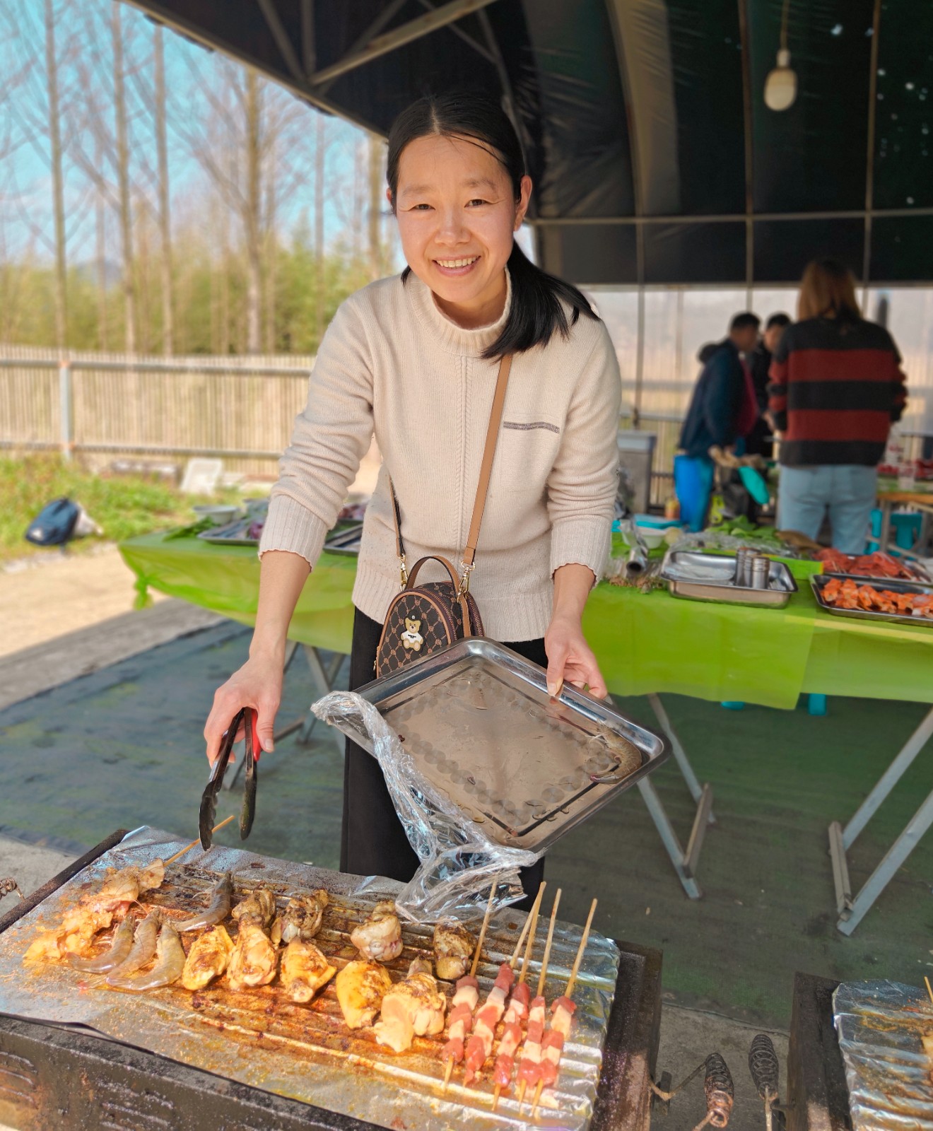 柴火不停,香味不断。一会儿功夫,那边“滋滋”飘香的烤虾、烤里脊、烤肉串、烤香肠不断呈上桌来。这边红烧鱼块、土豆烧鸡、酸辣土豆丝、番茄炒蛋、鱼头豆腐汤、香菇鲜笋鸡汤、洋葱炒蛋、鲜笋炒面、水饺、青团……各组的大作陆陆续续上桌了,好不丰盛!
