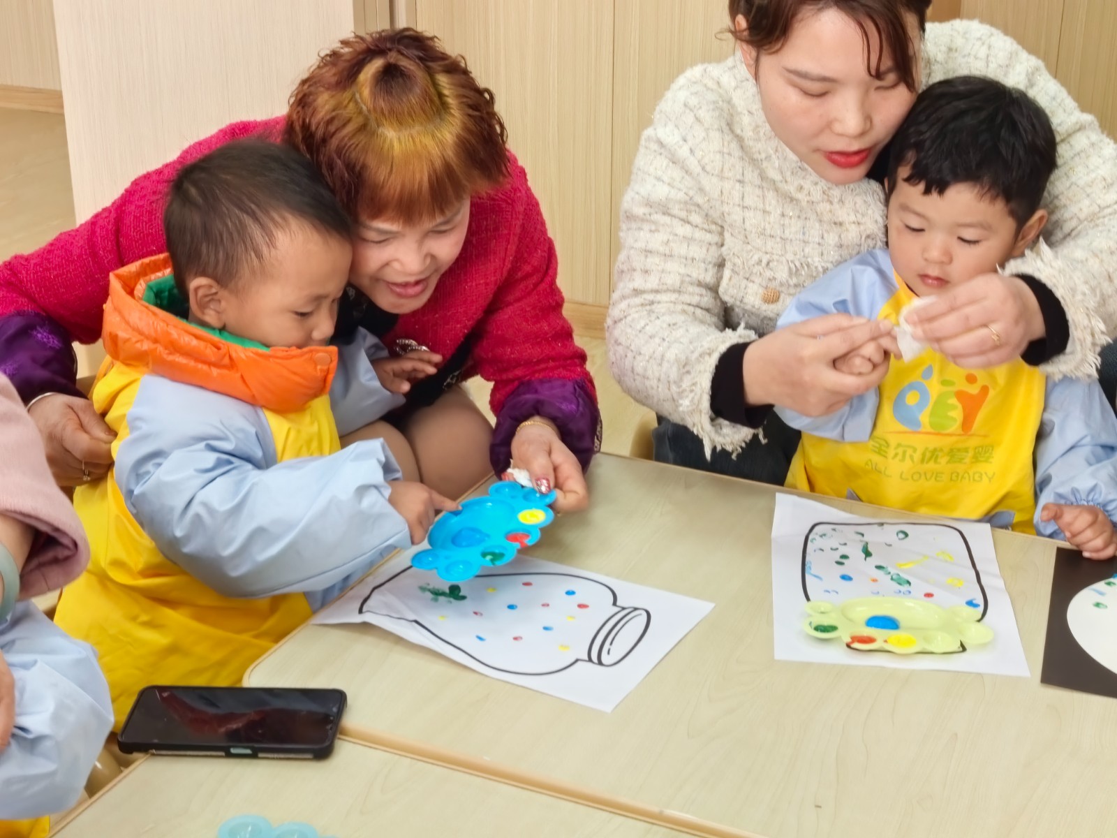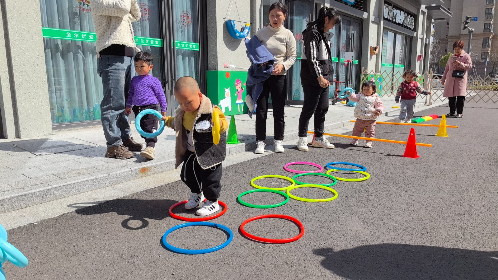 首先,志愿者老师与参加活动的亲子家庭互相做了自我介绍,消除彼此陌生感。音乐律动环节,幼儿们双手握拳,双臂放置在胸前,有节奏地跟着老师做起了绕圈摆动的动作。热身结束后老师以身穿的衣服颜色引出四色卡片,带领幼儿们正确认识对应的颜色,为了巩固加深他们对颜色的认知,志愿者老师还为幼儿们准备了四色颜料,用他们的小手指蘸取不同的颜色,在白纸上进行点点画创作,随着一点一点的落下,纸瓶内的“小糖果”越来越多。有的幼儿发挥自己的创意与想象力,完成了自己独特的涂鸦作品。万物生长,不负春光,户外活动中,幼儿们个个都活力十足,过独木桥,跨栏,跳圈圈,勇敢地闯过了每一关。
