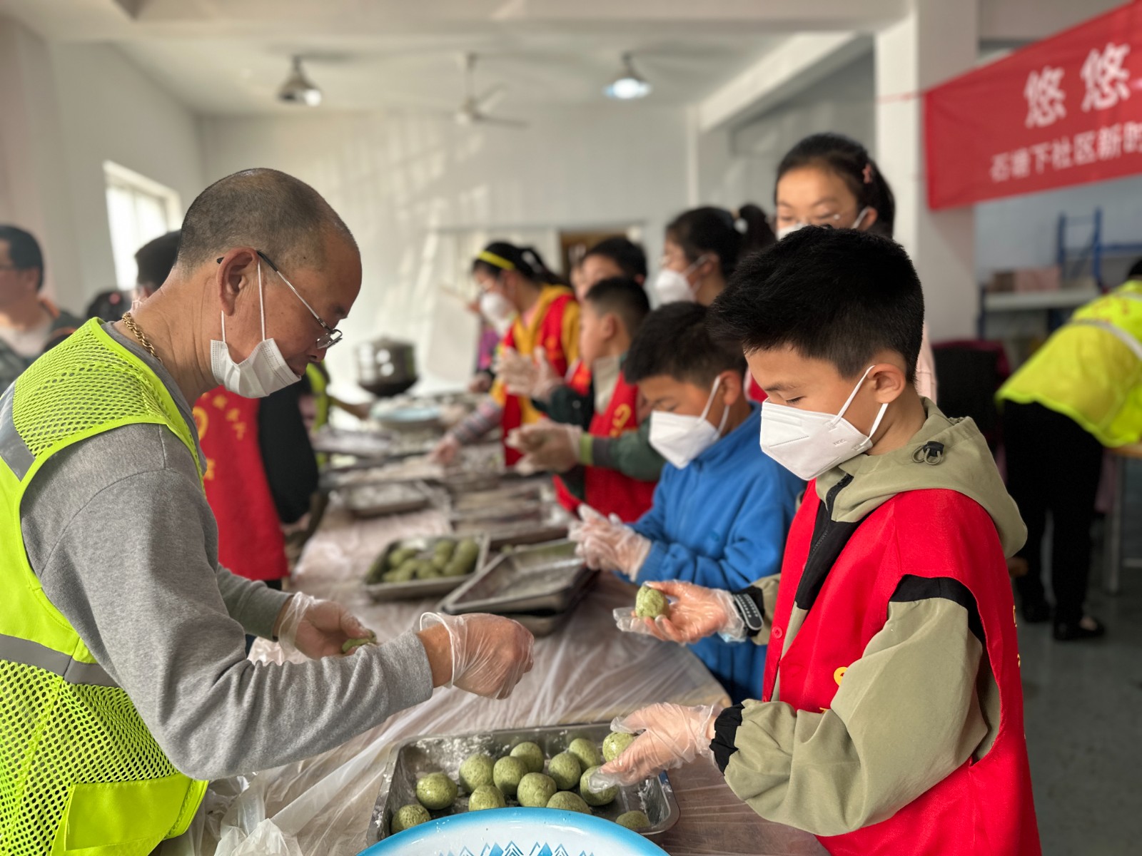活动现场,社区网格员和志愿者们将准备好的艾青叶、面粉、馅料搬上桌,志愿者陈阿姨边做边讲解青团的制作方法以及小技巧,小朋友们跟着陈阿姨的方法一步一步的操作,在有说有笑中,将艾叶汁揉进糯米团,裹入馅料,捏团成型,一只只圆滚滚的青团就展现在大家眼前。小朋友们迫不及待地将青团放进蒸锅,等待蒸熟出炉。熟透的青团散发着艾草香气,香糯可口,大家连连称赞青团还是自己做的更香。活动结束后,青少年们将新鲜出炉的青团送到辖区独居老人手上,诚意满满的送上这一份独属于春天的味道。