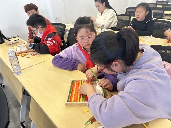 活动中,社工首先向大家介绍竹编画这一非遗文化,它不仅蕴含着传统编织工艺,还是书法绘画艺术与编织的结合,小朋友听后都十分好奇成品是什么样子,在社工的指导下,小朋友们用挑一压一、挑一压三的手法让竹篾交错固定。编织过程中,孩子们开始有些手忙脚乱,通过大家一起讨论,一遍遍地尝试和调整后,掌握了一些技巧,越编越顺手、越编越熟练,完整的竹编逐渐成型,最后将画好的镂空图案放置在竹编上,就呈现出色彩缤纷的“中国梦”“我爱你中国”等精美画作。“非常感谢社区组织这样的活动,让孩子们在良好的爱国氛围中体验非遗的独特魅力,这个活动很有意义。”陪同孩子参加活动的家长分享着自己的感受。