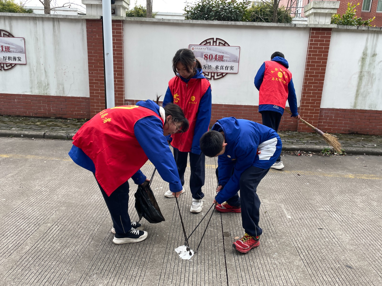 35日上午学生们利用课余时间在校园周边开展清洁活动,学生们在老师和志愿者的带领下,带着卫生工具将校园周边的卫生进行清理,不留卫生死角,为校园环境美化做出了自己的一份贡献。