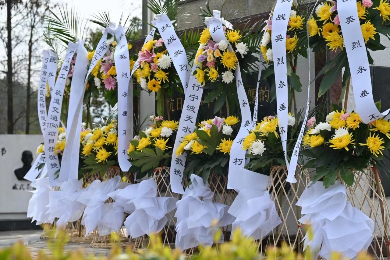 在同泰嘉陵园内,抗战纪念碑前,党员代表、团员代表整装列队,全体肃立,向烈士敬献花篮、鞠躬默哀,表达对英雄们的无限敬意和深深怀念,感受革命先烈为国家和民族献身的精神。来自庄桥街道社区卫生服务中心、庄桥市场监督管理所、宁波建工—轨道交通TJ7011项目部、中国农业银行宁波天水支行等7个单位代表纷纷敬献花篮,现场的每位同志绕碑站立献上纯白菊花,每一朵鲜花都代表着一份对英雄精神的致敬,对历史的深刻铭记。鲜花哀思后,由宁波市教育集团党支部党员代表潘老师在烈士纪念碑前宣讲《清明祭英烈 ·吾辈当自强》,她的声音嘹亮、语句铿锵、情辞激越,使人产生共鸣,“我是一名教育工作者,将继续传承‘爱与责任’的师德灵魂,不忘初心,砥砺前行,继承先烈遗志,用实际行动实现历史和时代赋予吾辈青年的庄严使命”。