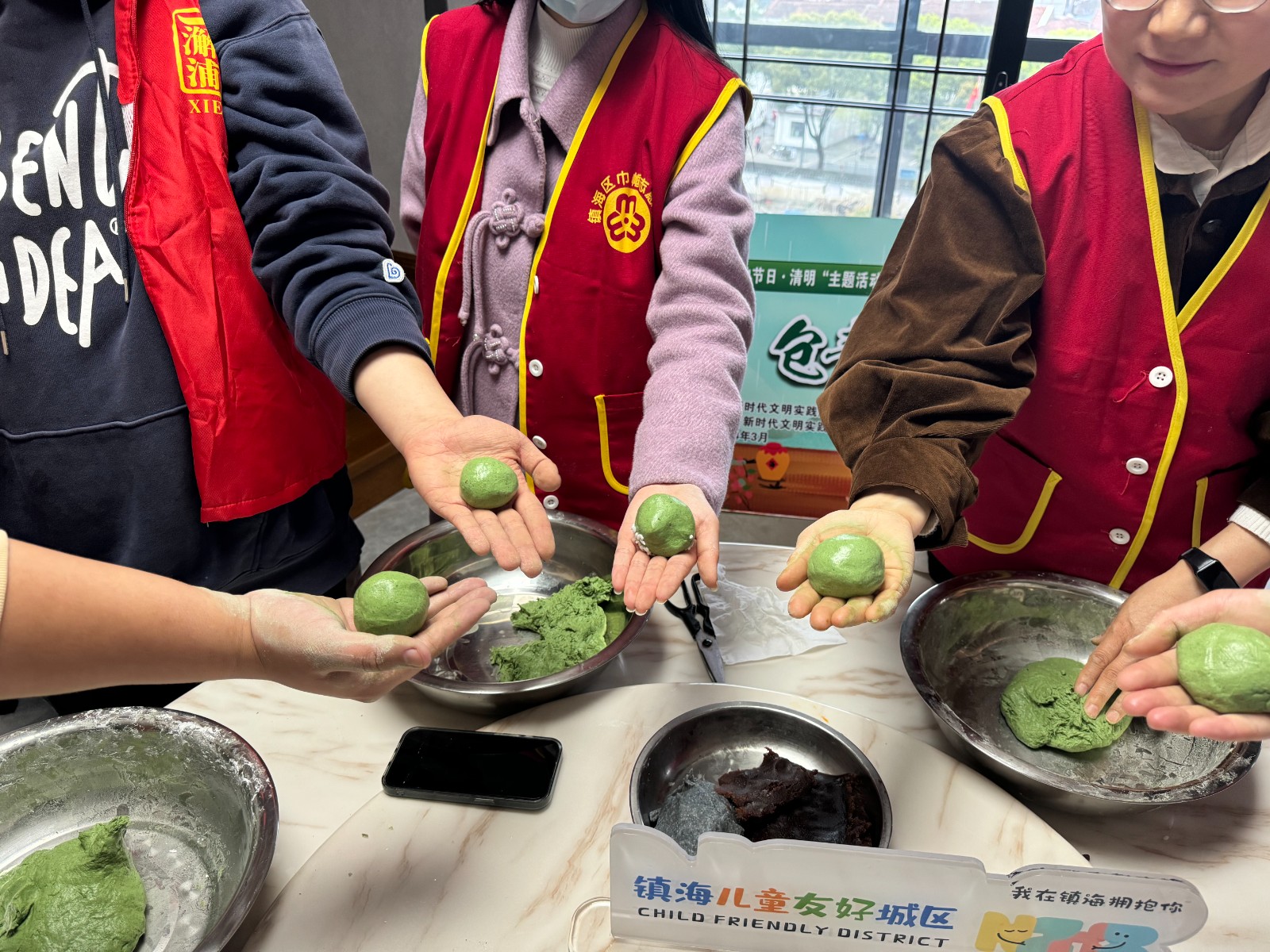 妇联执委和社区志愿者大家分工合作,我捻青、和粉,你揉粉、裹馅,不一会儿一个个模样俏丽的青团就诞生了,现场气氛和乐融融。待青团蒸熟后,大家分批将热腾腾地青团送到困难老人,残疾妇女手中,让他们共尝节日美食。
