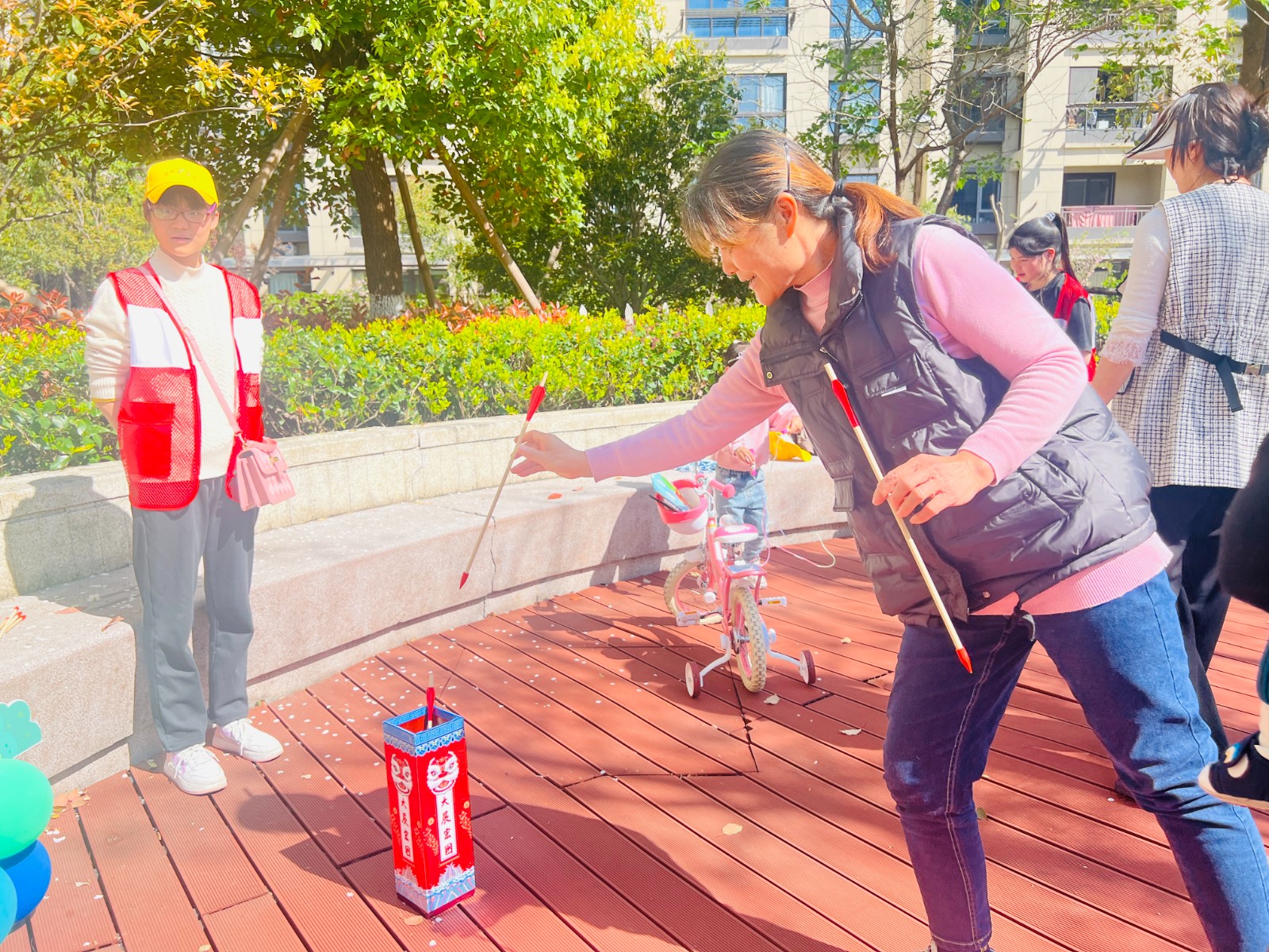 本次趣味运动会以“春意自然”为主题,分为“跳跳芽”、“春射柳”“识百花”“圈住春”“童伴行”五个项目。居民们手持比赛成绩记录单辗转于各个项目中。在套圈比赛场地,运动员们手持色套圈,瞄准目标,一展身手。“春射柳”投壶比赛中,大家手持,轻巧地投入“壶”中,每一次成功的投掷都引来阵阵掌声和欢呼。“识百花”环节让居民在游戏中深刻认识了各种花卉。